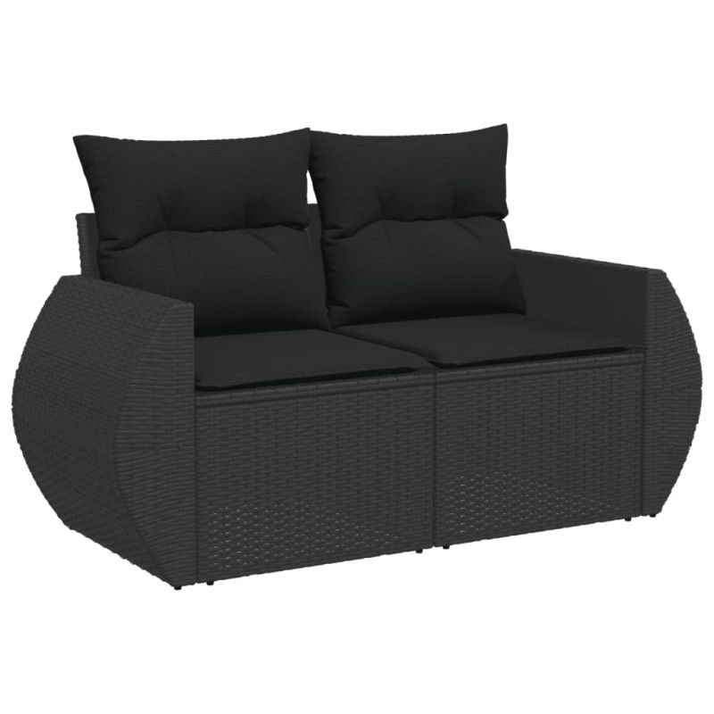 Градински диван с възглавници, двуместен, черен, полиратан