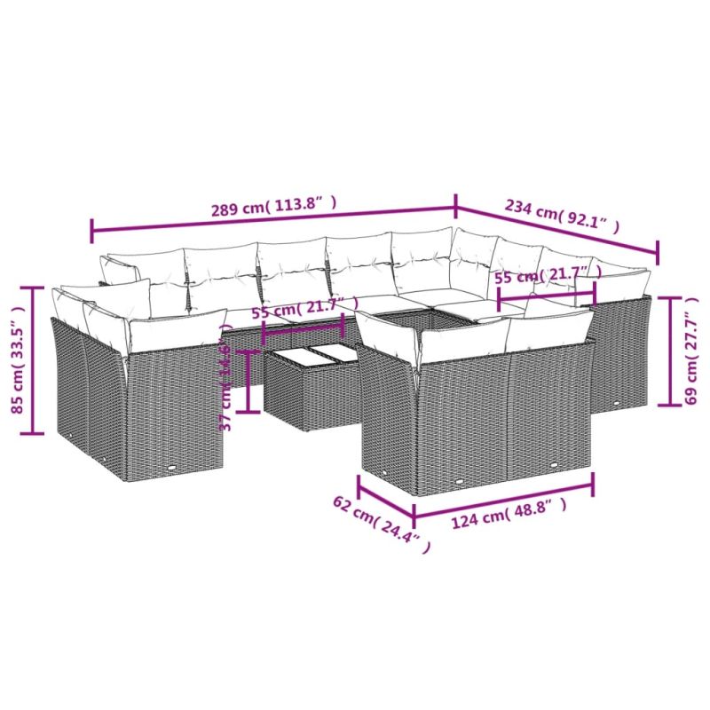 Градински диван с възглавници, 13 части, черен, полиратан