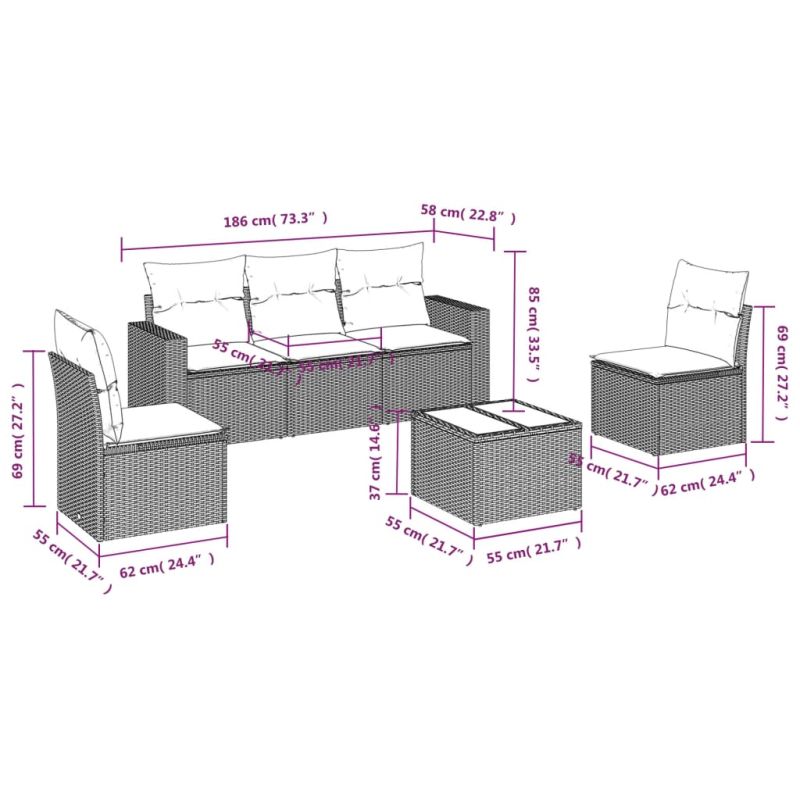 Градински диван с възглавници, 6 части, черен, полиратан