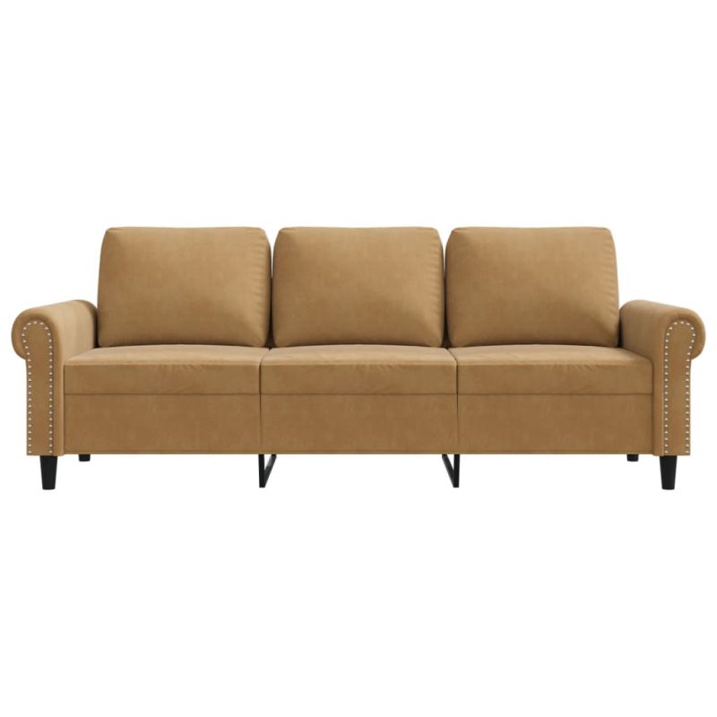 Този 3-местен диван е отлично място за вашето време за разговори, четене, гледане на телевизия или просто почивка. Той е предназначен да бъде фокусна точка във вашия дом. Меко кадифе: Кадифето е мека и луксозна материя, която се отличава с гъста купчина равномерно отрязани влакна за гладка повърхност. Кадифената тъкан се отличава с меко усещане, което я прави приятна на допир.Здрава и стабилна рамка: Металната рамка на тапицирания диван осигурява здравина и стабилност.Удобна седалка: Диванът е много удобен с дебело подплатените седалки, подлакътниците и възглавниците за гърба.Привличащ вниманието дизайн: С изчистен, но модерен дизайн, това канапе е предназначено да привлича вниманието във вашата стая. Максимално 110 кг на седалка. Съобразете се с риска от открит огън и други източници на силна топлина в близост до продукта.