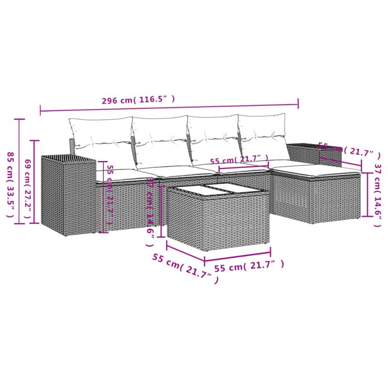 Градински диван с възглавници, 6 части, полиратан, сив