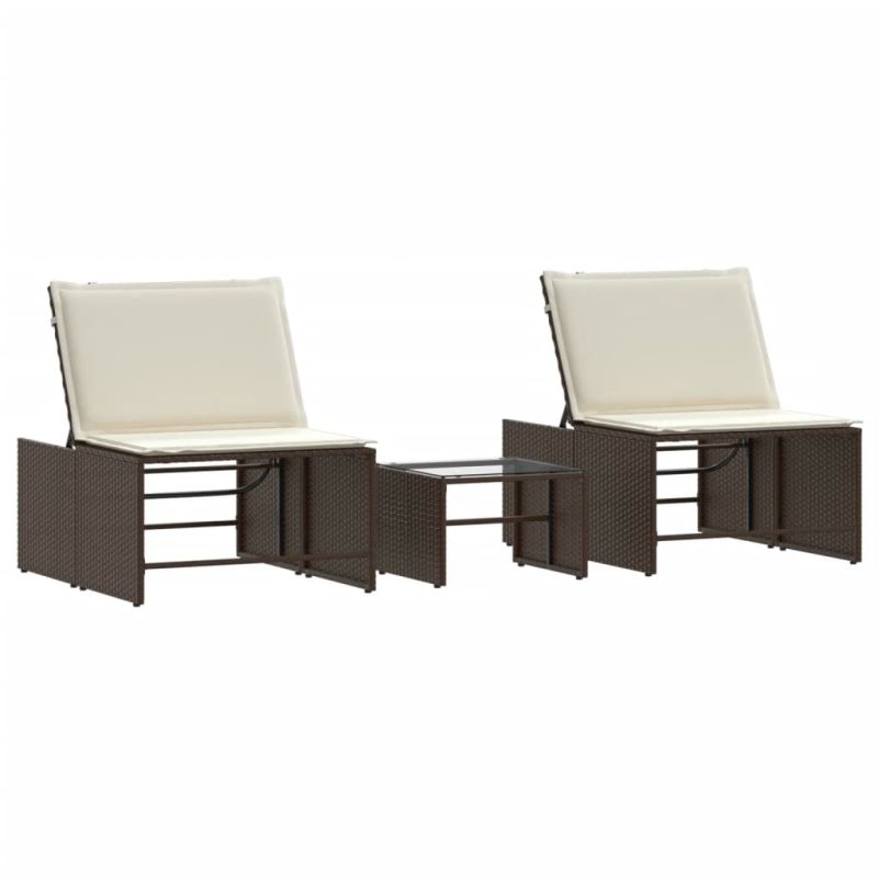 Шезлонги, 2 бр. с маса, кафяви, полиратан