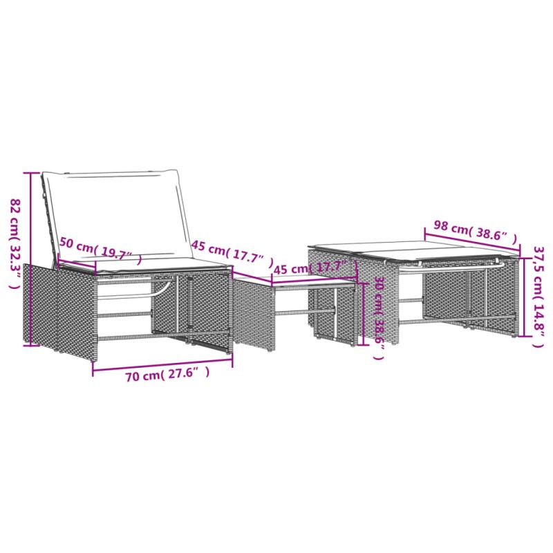 Отпуснете се и се насладете на открито в тези удобни модулни шезлонги с маса! Издръжлив материал: PE ратанът, известен още като полиратан, е здрав, лесен за поддръжка синтетичен материал, който прилича на естествен ратан. Той е лек, лесен за почистване и често се използва за градински мебели поради своята издръжливост и устойчивост на атмосферни влияния. Регулируема облегалка: Тази градински мебел разполага с облегалка с 4 регулируеми позиции, което ви позволява лесно да намерите най-удобната и подходяща позиция за релакс. Стъклен плот: Плотът на градинския плот е изработен от здраво и издръжливо закалено стъкло, което го прави лесен за почистване с влажна кърпа и добавя нотка елегантност към вашето външно пространство. Универсални места за сядане и почивка: Този модулен комплект мебели включва два основни модула, които могат да се използват отделно като два стола с маса или да се комбинират безпроблемно, за да образуват един пълноценен шезлонг с маса. Идеален за двама души, седнали един до друг, или за един човек, който се отпуска удобно. Освен това, дебело подплатените възглавници осигуряват изключителен комфорт както за сядане, така и за лежане. Свалящ се и перещ се калъф: Възглавницата на седалката е с подвижен калъф за лесно пране и поддръжка. Полезно е да знаете:За да сте сигурни, че вашите градински мебели ще останат красиви, препоръчваме да ги защитите с водоустойчив калъф.