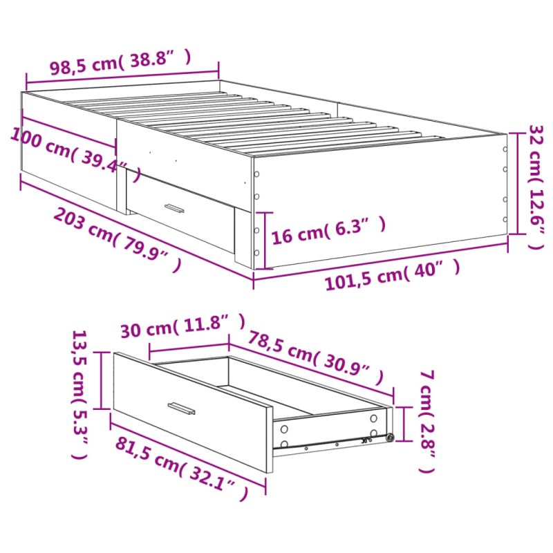 Добавете модерен щрих към спалнята си с тази рамка за легло с чекмеджета! Тя е практично и декоративно допълнение към вашето жилищно пространство. Издръжлив материал: Рамката на леглото е изработена от инженерна дървесина. Инженерната дървесина е с изключително качество с гладка повърхност и се отличава със здравина, стабилност и устойчивост на влага.Здрави летви: Летвите от шперплат осигуряват добро разпределение на теглото, като гарантират, че матракът ще остане на мястото си при всяко завъртане и обръщане на тялото ви по време на сън.Функция за съхранение: Включените чекмеджета осигуряват достатъчно място за съхранение на вашите най-важни неща, поддържайки стаята ви чиста и подредена. Полезно е да знаете:Тази рамка за легло е с ламелна основа и включва ламелите.Матракът не е включен в това легло. Предлагаме разнообразна селекция от матраци. Можете да разгледате нашия магазин за подходящ матрак.