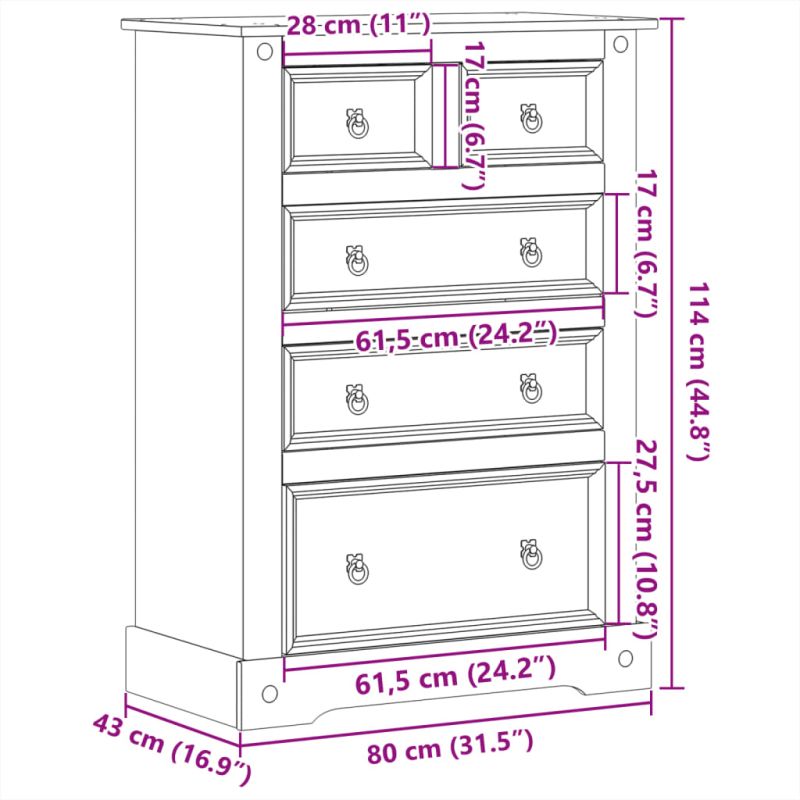Този дървен скрин с чекмеджета, отличаващ се с непреходен външен вид, е предназначен да бъде отлично допълнение към вашия дом. Масивна борова дървесина: Масивната борова дървесина е красив естествен материал. Боровата дървесина е с продълговати шарки, а чеповете придават на материала характерния му рустик вид. Изработен от масивна борова дървесина, скринът е издръжлив и здрав.Достатъчно пространство за съхранение: Шкафът за съхранение има 5 чекмеджета с различни размери, осигуряващи достатъчно място за вашите различни нужди за съхранение и поддържащи нещата ви организирани.Лесен за поддръжка: Сайдбордът се почиства лесно с влажна кърпа и изисква по-малко поддръжка.Метални дръжки: Шкафът с чекмеджета се предлага с метални пръстени дръжки, които правят чекмеджетата лесни за отваряне и затваряне, като същевременно добавят допълнителна красота. Внимание:За да предотвратите преобръщане, този продукт трябва да се използва с предоставеното устройство за закрепване на стена.