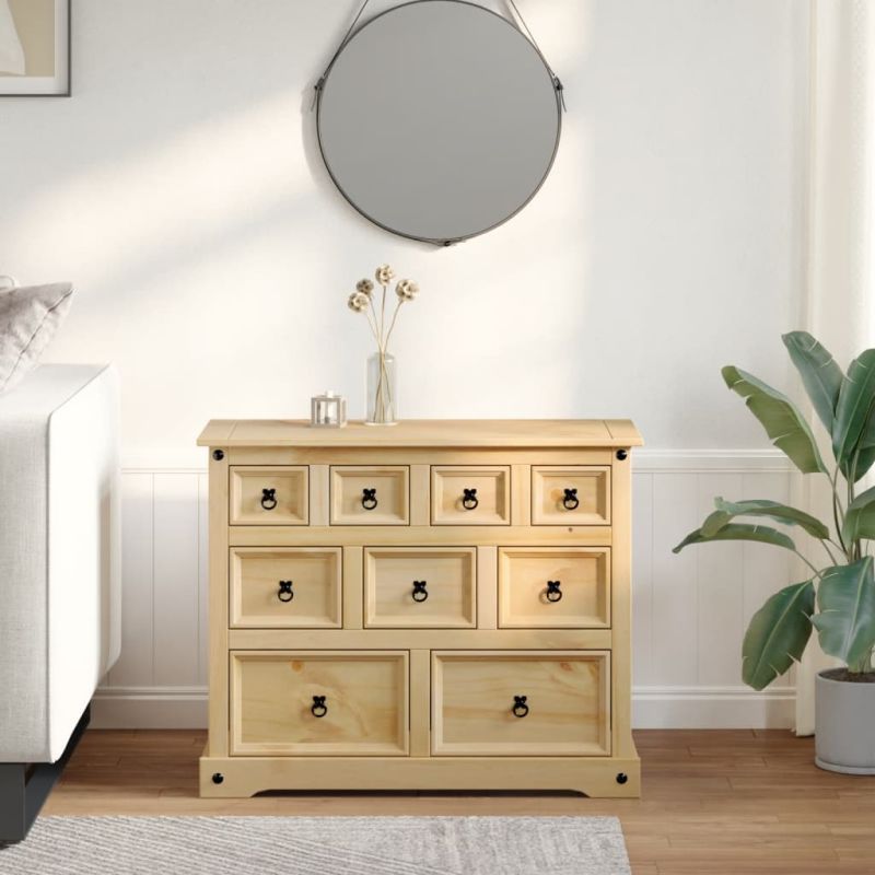 Този дървен скрин с чекмеджета, отличаващ се с непреходен външен вид, е предназначен да бъде отлично допълнение към вашия дом. Масивна борова дървесина: Масивната борова дървесина е красив естествен материал. Боровата дървесина е с продълговати шарки, а чеповете придават на материала характерния му рустик вид. Изработен от масивна борова дървесина, скринът е издръжлив и здрав.Достатъчно пространство за съхранение: Шкафът за съхранение има 9 чекмеджета с различни размери, осигуряващи достатъчно място за вашите различни нужди за съхранение и поддържащи нещата ви организирани.Лесен за поддръжка: Сайдбордът се почиства лесно с влажна кърпа и изисква по-малко поддръжка.Метални дръжки: Шкафът с чекмеджета се предлага с метални пръстени дръжки, които правят чекмеджетата лесни за отваряне и затваряне, като същевременно добавят допълнителна красота. Внимание:За да предотвратите преобръщане, този продукт трябва да се използва с предоставеното устройство за закрепване на стена.