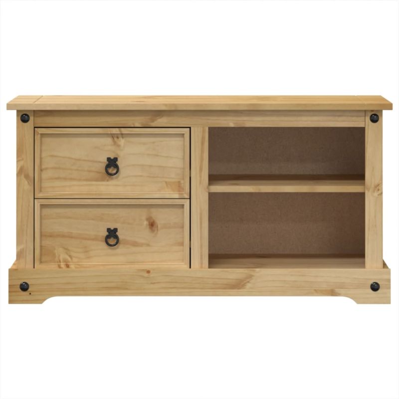 Този дървен шкаф за телевизор с достатъчно място за съхранение е практично допълнение към вашата всекидневна или спалня. Масивна борова дървесина: Масивната борова дървесина е красив естествен материал. Боровата дървесина е с продълговати шарки, а чеповете придават на материала характерния му рустик вид. Изработена от масивна борова дървесина, ТВ поставката е издръжлива и здрава.Достатъчно място за съхранение: ТВ поставката разполага с 2 чекмеджета и 2 рафта, осигуряващи достатъчно място за съхранение, за да съхранявате вашите списания, книги, DVD дискове и мултимедийни устройства добре организирани и подръка.Метални дръжки: ТВ конзолният шкаф се доставя с метални пръстеновидни дръжки, която прави чекмеджетата лесни за отваряне и затваряне, като същевременно добавят допълнителна красота.Лесна поддръжка: ТВ поставката шкаф се почиства лесно с влажна кърпа и изисква по-малко поддръжка. Внимание:За да предотвратите преобръщане, този продукт трябва да се използва с предоставеното устройство за закрепване на стена.