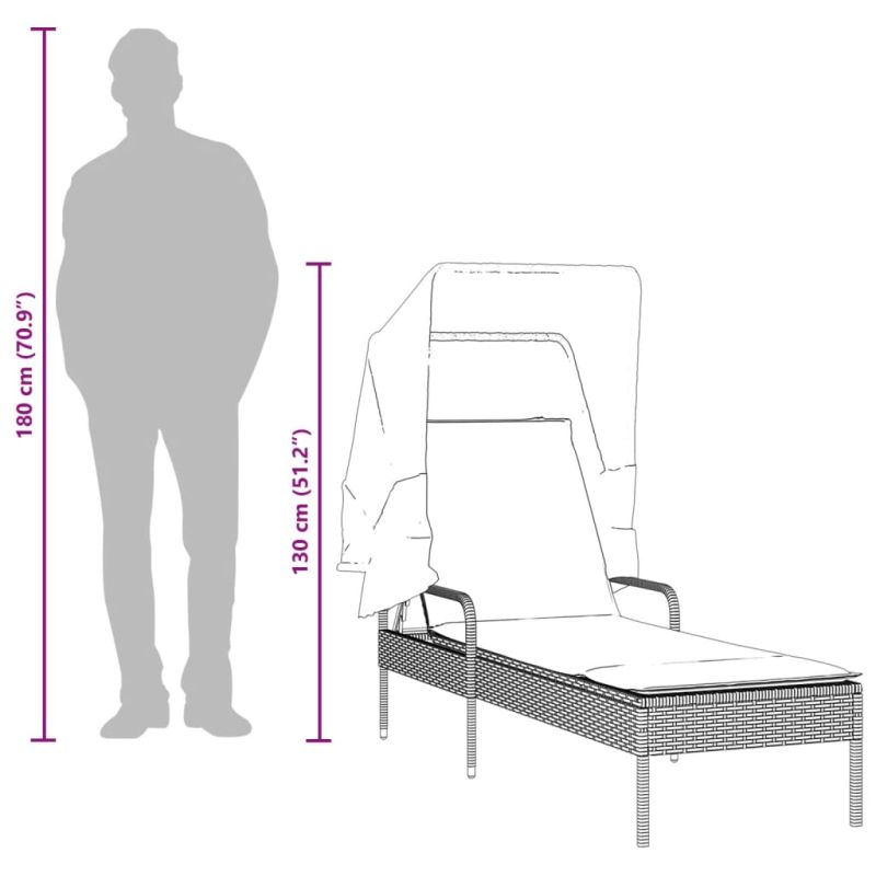 Отпуснете се и се насладете на времето на открито в този удобен шезлонг! Издръжлив материал: PE ратан, известен също като полиратан, е здрав синтетичен материал с малко необходима поддръжка, който прилича на естествен ратан. Той е лек, лесен за почистване и често се използва за външни мебели поради своята издръжливост и устойчивост на атмосферни влияния. Регулируема облегалка: Тази външна мебел разполага с облегалка с 4 регулируеми позиции, което ви позволява лесно да намерите най-удобната и подходяща позиция за почивка. Прибиращ се сенник: Благодарение на прибиращия се сенник можете да създадете хладна, приятна външна среда през целия ден. Удобна седалка: Тази мебел за открито, снабдена с плътно подплатена възглавница, предлага удобство при сядане. Калъф, който може да се сваля и може да се пере: Възглавницата на седалката разполага с калъф, който може да се сваля за лесно пране и поддръжка. Добре е да се знае:За да сте сигурни, че вашите външни мебели ще останат красиви, ви препоръчваме да ги защитите с водоустойчиво покривало. Максимално 110 кг на седалка. Съобразете се с риска от открит огън и други източници на силна топлина в близост до продукта.