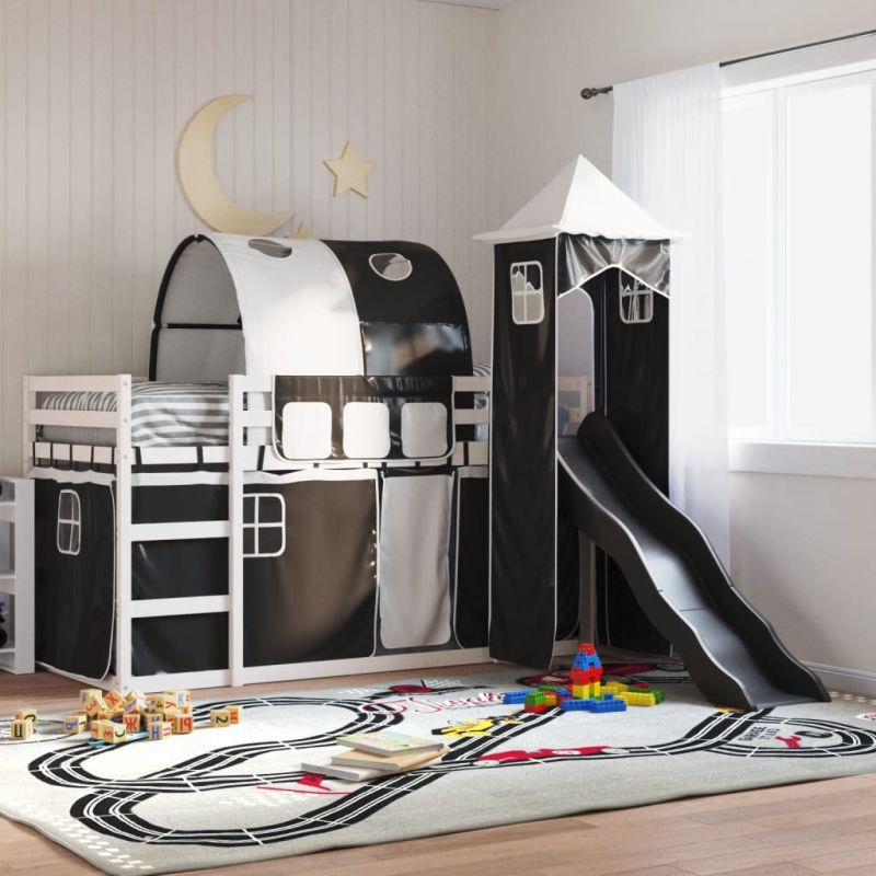 Двуетажно легло с пързалка и завеси, бяло и черно, 90x200 см