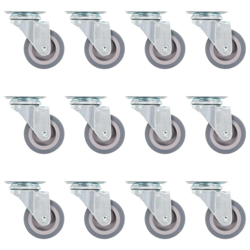 Този комплект от 12 въртящи се колелца ще бъде идеалният аксесоар за дребно оборудване и мебели като работна маса, количка, масичка за кафе, стойка за растения, рафт за книги, количка за пазаруване и др. Тези колелца са изработени от TPR (термопластична гума), която се отличава с добра устойчивост на удари и вибрации, което позволява на колелата да работят безпроблемно и тихо. В допълнение, меката им повърхност ефективно предпазва пода от надраскване. В допълнение, желязната рамка с цинково покритие е много устойчива на ръжда и по този начин допълва здравината и издръжливостта на колелцата. Всяко колелце има максимална товароносимост до 35 кг. Доставката включва 12 въртящи се колела.