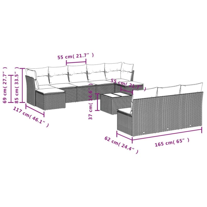 Градински комплект с възглавници, 11 части, светлосив полиратан