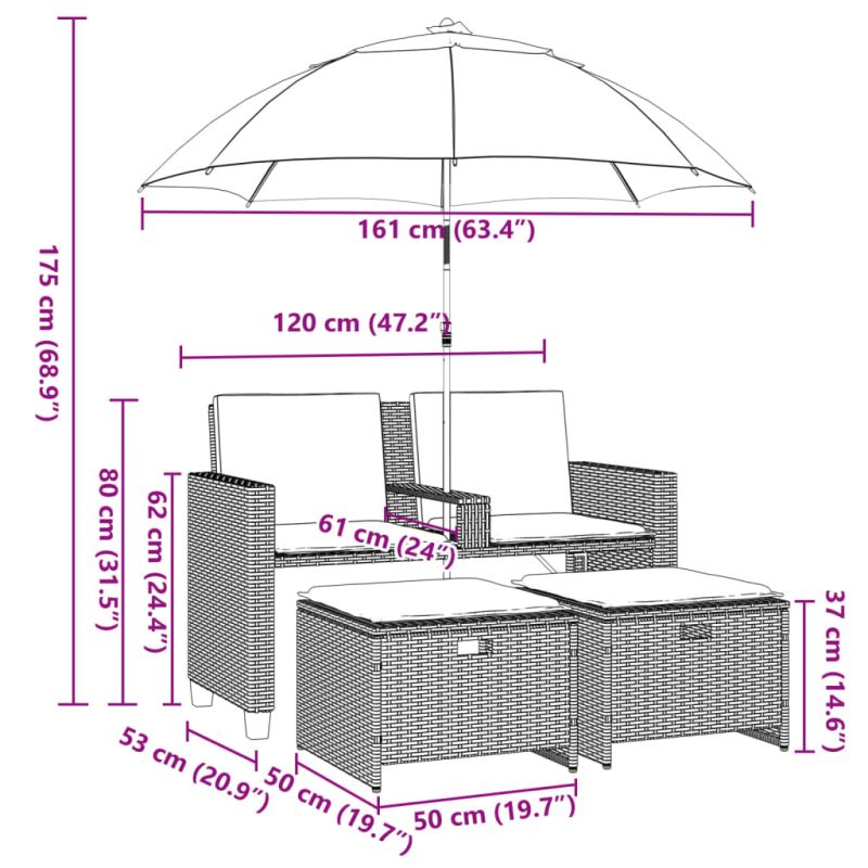Този градински диван с чадър и табуретки е идеалното допълнение към вашия заден двор, тераса или вътрешен двор, осигурявайки удобно и привлекателно пространство за разговори със семейството и приятелите или просто за почивка и забавление на открито. Издръжлив материал: PE ратан, известен също като полиратан, е здрав синтетичен материал с малко необходима поддръжка, който прилича на естествен ратан. Той е лек, лесен за почистване и често се използва за външни мебели поради своята издръжливост и устойчивост на атмосферни влияния.Практичен чадър: Градинският диван разполага с чадър с механизъм за накланяне, който ви позволява лесно да регулирате сенника за оптимална сянка и защита от слънцето.Калъф, който може да се сваля и може да се пере: Тези възглавници имат подвижни калъфи за лесно пране и поддръжка.Компактно съхранение: Тези табуретки за крака могат да бъдат спретнато пъхнати под седалките, което позволява пестене на място за съхранение.Здрава и стабилна рамка: Стоманената рамка с прахово покритие гарантира, че градинската мебел е здрава и стабилна за ежедневна употреба на открито. Добре е да се знае:За да сте сигурни, че вашите външни мебели ще останат красиви, ви препоръчваме да ги защитите с водоустойчиво покривало.