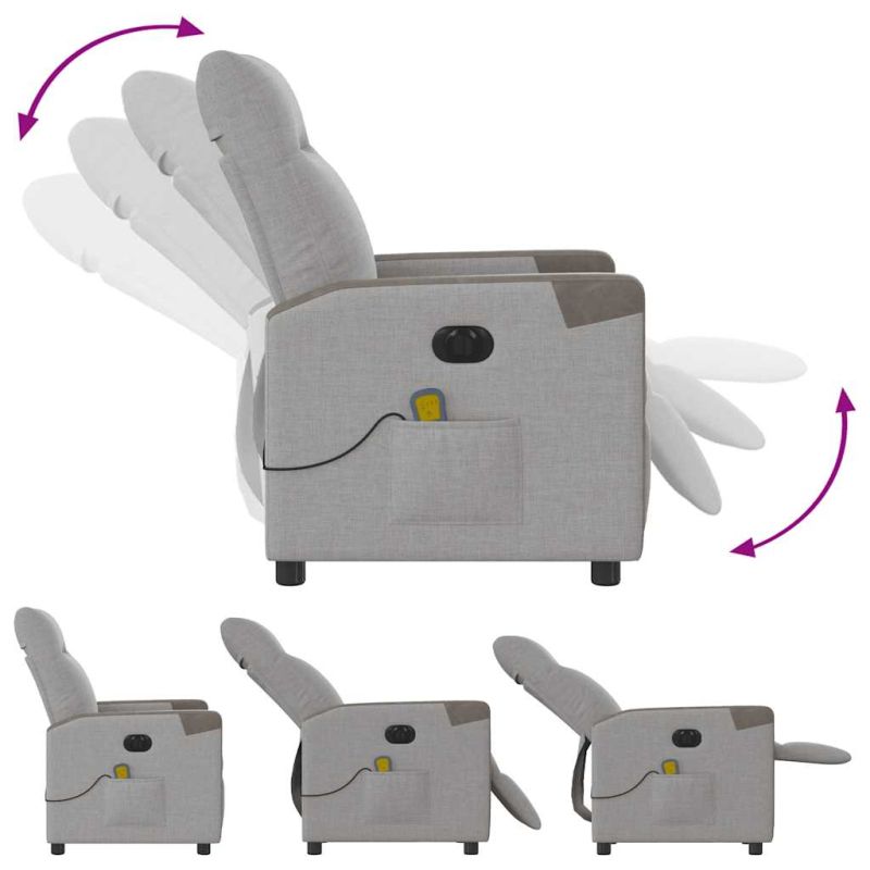 Облегнете се и се отпуснете в този изключително комфортен електрически масажен реклайнер стол! Електрическа функция за накланяне: Този стол с облегалка е оборудван с електрически мотор, който помага автоматично да регулирате поставката за крака и облегалката до произволна позиция според вашето удобство с просто натискане на бутона отстрани на стола. Тази функция позволява максимален наклон от 135 градуса. Освен това облегалката може да се върне автоматично на първоначалното си място с лесно натискане на бутона.Функция за вибрация: Представените 6 масажни точки ви позволяват да изпитате по-целенасочен масаж. Освен това включеното ръчно управление ви позволява да избирате различни програми за масаж. Функцията за масаж се захранва от USB конектор, който изисква сертифициран 5V USB захранващ източник (не е включен).Удобно седене: Дебело подплатената седалка, облегалката и широките подлакътници, покрити с текстил, осигуряват уютно и топло усещане, което ви кара да се чувствате като в прегръдка, докато седите. Тъканта се отличава със семпъл и изчистен вид и е дишаща и издръжлива.Удобен страничен джоб: Този фотьойл има страничен джоб за вашето дистанционно управление или за поддържане на вашите основни вещи леснодостъпни.Здрава и стабилна рамка: Рамката, изработена от дърво и метал, осигурява здрава структура и стабилност. Този накланящ се фотьойл е удобен и издръжлив. Този уред може да се използва от деца на възраст от 8 години и нагоре, както и от лица с намалени физически, сетивни или умствени способности, или с липса на опит и познания, ако са получили надзор или инструкции относно използването на уреда по безопасен начин и разбират съществуващите опасности. Децата не трябва да си играят с уреда. Децата не трябва да почистват и да извършват потребителска поддръжка без надзор.