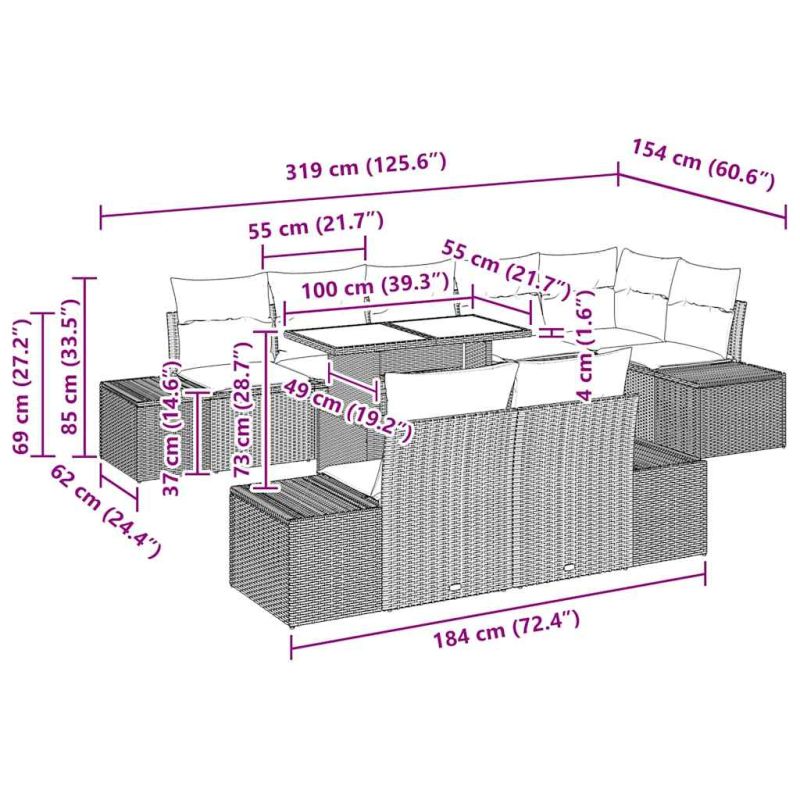 Този модулен комплект градински дивани е стилен и адаптивен за вашата тераса или градина. Съвременният му дизайн има чисти линии и функционалност, което му позволява да се вписва в различни пространства. Перфектен е за отпускане или организиране на уютни вечери на открито. Комплектът отразява модерна елегантност и предлага практични предимства, което го прави страхотен избор за тъй нареченото "външно" изживяване през пролетта и лятото. Материали: Комплектът е направен от висококачествен полирано ратан, устойчив на износване, който е идеален за навън. Този материал изглежда стилно и издържа на всякакви метеорологични условия, осигурявайки дълготрайност и визуална привлекателност през всички сезони. Включени компоненти: Състои се от четири странични дивана, едно ъглово място и три централни места, което ви позволява да създавате различни конфигурации. Всеки компонент има полирана ратанова повърхност и удобни седалки, идеални за дълги часове на открито. Характеристики / Функция / Дизайн: Най-впечатляващата функция е регулируемата маса, която се настройва от кафе до кухненска височина. Този дизайн добавя многофункционалност за различни поводи, от сутрешно кафе до семейни вечери. Препоръчителни приложения: Комплектът е чудесен за градини и тераси и може да се адаптира към различни социални обстановки. Модулната му природа го прави подходящ както за лична употреба, така и за забавления, осигурявайки лесно пренареждане според нуждите на групата. Грижа и поддръжка: Поддържайте го в отлично състояние, като го покривате, когато не го използвате. Редовната грижа гарантира, че той остава стилен акцент на вашето открито пространство с години напред и повишава естетиката на градината или терасата ви.