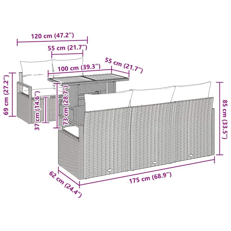 Този градински диван с възглавнички освежава откритото ти пространство с модерен и елегантен вид. Простият, но функционален дизайн го прави идеален за градини и тераси. Изграден е от полиратан и е обрамчен с прахово боядисана стомана, удобен е и здрав. Освен това, топлата масивна акациева дървесина му придава перфектния баланс между стил и комфорт за всичките ти пролетни и летни забави. Комбинация Материали: Перфектна комбинация от полиратан, здрав прахово боядисан метал и топла масивна акациева дървесина. Този комплект е готов за ежедневието и изглежда невероятно в всяка градина. Включени Компоненти: Включва 4 дивана с подлакътници, 1 централно място със съхранение и градинска маса – идеално за комфортни опции за сядане и интелигентно организиране на пространството. Избрани Функции: Проектиран за действие – UV устойчивите материали лесно понасят яркото слънце, а подвижните възглавнички ти дават възможност да поддържаш уют и чистота. Препоръчано Използване: Идеален за релакс в градината или за социални събирания на терасата, този комплект се вписва чудесно – от слънчеви моменти до вечерни срещи, носейки свежо сезонно настроение. Грижа и Поддръжка: Използвай покривало, когато не го ползваш, и го избърсвай с влажна кърпа от време на време. Тези съвети помагат да поддържаш градинския комплект в отлично състояние и да удължиш живота му.