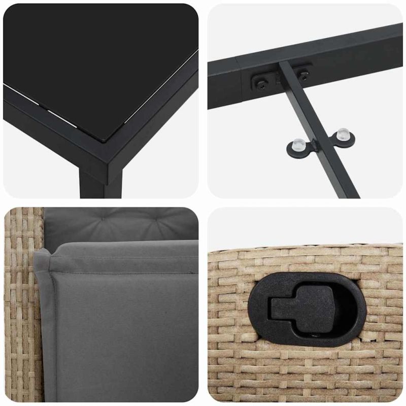 Този модерен комплект градинска маса и столове подобрява всяка градина или тераса с изчистен дизайн, който съчетава простота и функционалност. Проектиран за открито, той допълва съвременния стил, създавайки идеалната обстановка за летни събирания. Комплектът се отличава с здраво тяло, устойчиво на време, предлагайки уютно място за хранения, развлечения или просто релаксация. Умелото съчетание на материали добавя нотка лукс, докато създава приятна атмосфера. Материали: Комплектът за хранене е изработен от качествени полиратан и стомана. Полиратанът предлага елегантен текстурен вид и е устойчив на времето, а стоманената рамка осигурява здравина и дълготрайност. Включени компоненти: Комплектът идва с маса със стъклен плот и здрави стоманени крака, а столовете са с подлакътници за допълнителен комфорт. Всеки стол е с подложка за сядане, което прави разговора супер удобен. Тези елементи създават практично и стилно решение за вашето открито пространство. Функции: С многофункционалната облегалка, всеки стол осигурява комфорт, което го прави идеален за хранене или почивка. Дизайнът съчетава практичност и минимализъм, което го прави подходящ за различни стилове на открито от модерен до уютен. Препоръчителна употреба: Идеален за летни градински или терасови вечеринки, този комплект предлага разнообразни опции за сядане. Вътрешното му стилно излъчване го прави подходящо за интимни събирания или весели празници. Поддръжка и грижа: За да запазите комплекта красив, използвайте покривало, когато не се използва. Тази простичка практика го защитава от елементи и удължава живота на мебелите. Максимално 110 кг на седалка. Съобразете се с риска от открит огън и други източници на силна топлина в близост до продукта.