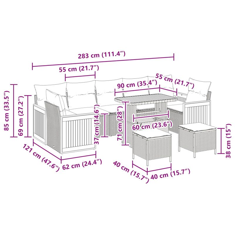 Сетът за градински диван е стилно проектиран да допълва градини и тераси, предлагайки удобно решение за сядане. Със своя минималистичен и функционален дизайн, той добавя елегантност на съвременните открити събирания. Материали: Комплектът включва полиратан и прахово боядисана стомана, които съчетават стил и здравина. Полиратанът придава модерен вид, а стоманата осигурява стабилност за открито. Включени компоненти: В комплекта получавате четири дивана с подлакътници, три централни места, две табуретки и многофункционална маса – всичко проектирано с акцент на комфорта. Подлакътниците и масичките са от масивна акациева дървесина, което добавя натурална красота. Функции / Функционалност / Дизайн: Издръжливите, UV-устойчиви материали осигуряват защита от слънце, а модулната структура позволява лесно пренареждане. Идеален за динамични открити пространства. Препоръчителни употреби: Перфектен за градини и тераси, комплектът е страхотен както за неформални кафета, така и за приятни градински партита. Адаптивният му дизайн го прави удачен за всякакви събирания. Грижа и поддръжка: За да запазите добрия вид на комплекта, ползвайте защитни покрития, когато не е в употреба, особено при дъжд. Чистете редовно с суха кърпа, за да запазите материалите в добро състояние.