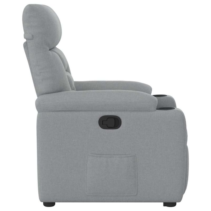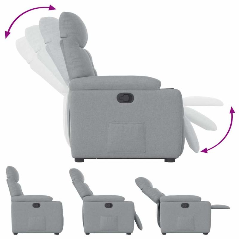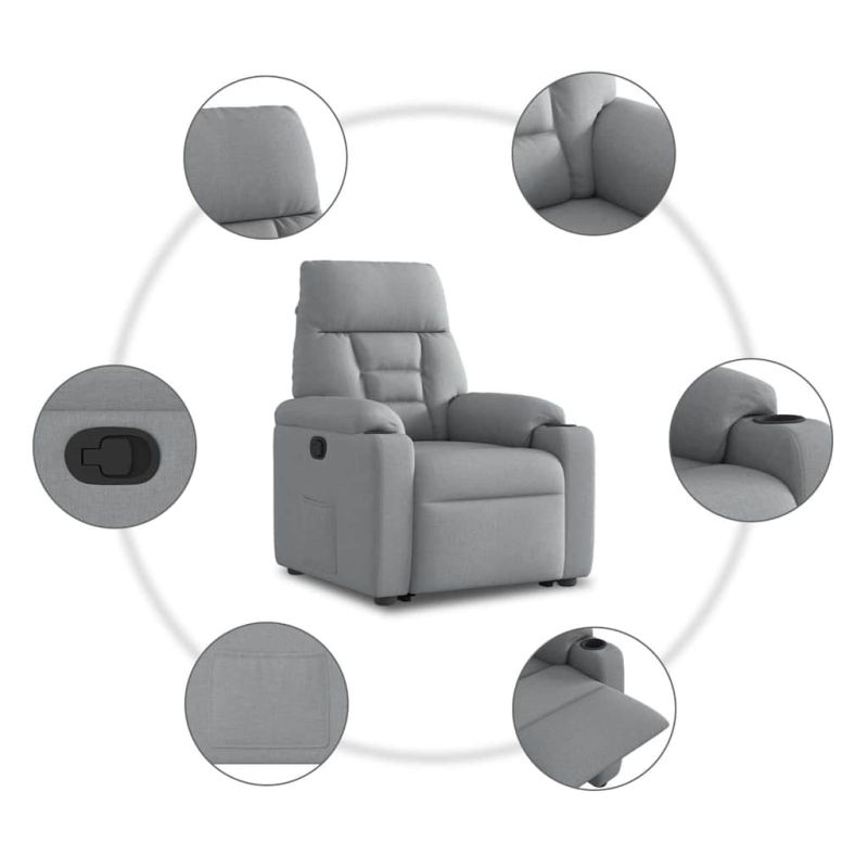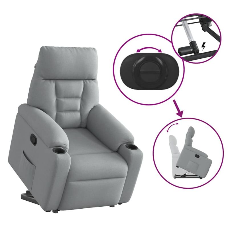 Облегнете се и се отпуснете в този изключително комфортен изправящ наклоняем стол! Функция за повдигане: Този стол реклайнер е оборудван с електрически двигател с функция за повдигане. Благодарение на функцията, която избутва целия стол нагоре, можете лесно да стоите, без да натоварвате гърба и коленете си с просто натискане на бутона.Функция за ръчно накланяне: Този накланящ се стол има дръжка от дясната страна. Можете ръчно да настроите поставката за крака и облегалката до произволна позиция според вашето удобство с просто издърпване на дръжката. Тази функция позволява максимален наклон от 135 градуса. Освен това облегалката може бързо да се върне на първоначалното си място с лесно издърпване на дръжката.Удобно седене: Дебело подплатената седалка, облегалка и широки подлакътници, покрити с текстил, осигуряват уютно и топло усещане, което ви кара да се чувствате като в прегръдка, докато седите. Тъканта се отличава със семпъл и изчистен вид и е дишаща и издръжлива.Здрава и стабилна рамка: Рамката, изработена от дърво и метал, осигурява здрава структура и стабилност. Този накланящ се фотьойл е удобен и издръжлив.