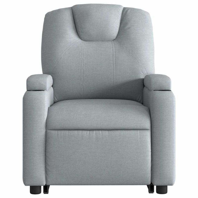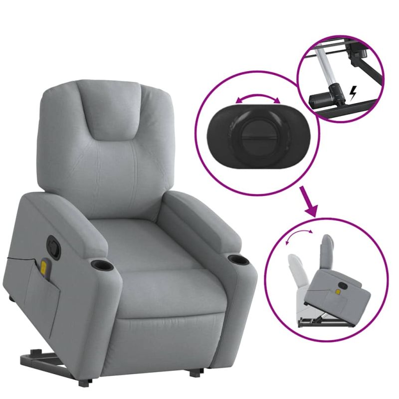 Облегнете се и се отпуснете в този изключително комфортен изправящ масажен и наклоняем стол! Функция за повдигане: Този стол реклайнер е оборудван с електрически двигател с функция за повдигане. Благодарение на функцията, която избутва целия стол нагоре, можете лесно да стоите, без да натоварвате гърба и коленете си с просто натискане на бутона.Функция за ръчно накланяне: Този накланящ се стол има дръжка от дясната страна. Можете ръчно да настроите поставката за крака и облегалката до произволна позиция според вашето удобство с просто издърпване на дръжката. Тази функция позволява максимален наклон от 135 градуса. Освен това облегалката може бързо да се върне на първоначалното си място с лесно издърпване на дръжката.Функция за вибрация: Представените 6 масажни точки ви позволяват да изпитате по-целенасочен масаж. Освен това включеното ръчно управление ви позволява да избирате различни програми за масаж. Функцията за масаж се захранва от USB конектор, който изисква сертифициран 5V USB захранващ източник (не е включен).Удобно седене: Дебело подплатената седалка, облегалката и широките подлакътници, покрити с текстил, осигуряват уютно и топло усещане, което ви кара да се чувствате като в прегръдка, докато седите. Тъканта се отличава със семпъл и изчистен вид и е дишаща и издръжлива.Удобни поставки за чаши и страничен джоб: Този фотьойл разполага с две удобни поставки за чаши за вашите напитки и страничен джоб за вашето дистанционно управление или за поддържане на вашите основни вещи леснодостъпни.Здрава и стабилна рамка: Рамката, изработена от дърво и метал, осигурява здрава структура и стабилност. Този накланящ се фотьойл е удобен и издръжлив. Максимално 110 кг на седалка.Този уред може да се използва от деца на възраст от 8 години и повече и от лица с намалени физически, сетивни или умствени способности или с липса на опит и познания, ако са получили надзор или инструкции за безопасно използване на уреда и разбират свързаните с него опасности. Децата не трябва да си играят с уреда. Децата не трябва да почистват и да извършват потребителска поддръжка без надзор. GPSR