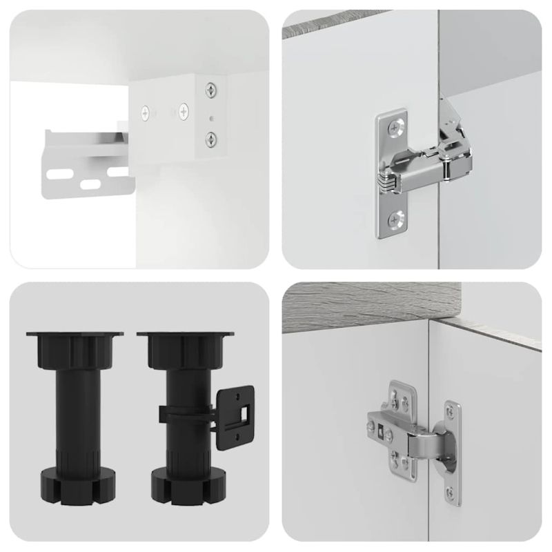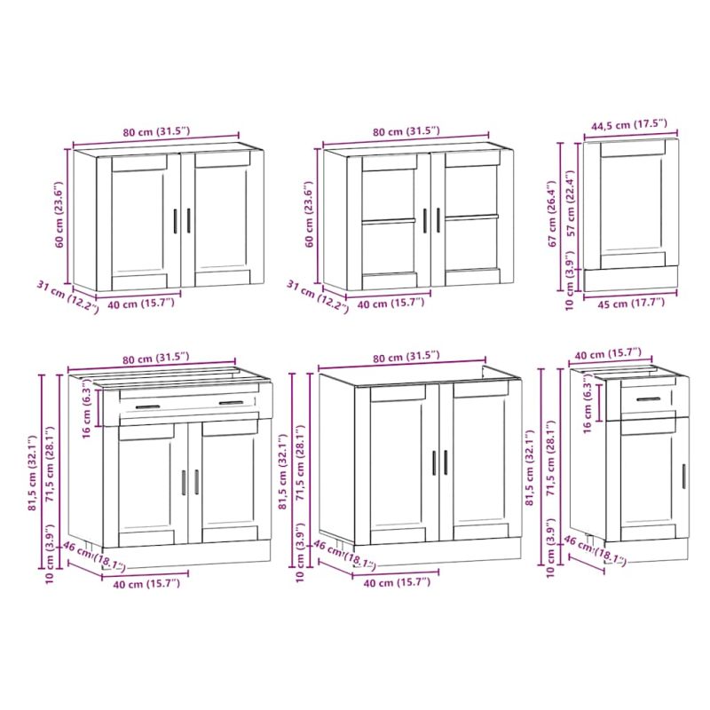 Този комплект кухненски шкафове от 7 части с елегантен дизайн оптимизира вашето кухненско пространство и осигурява достатъчно място за съхранение на вашите принадлежности! Стабилен и издръжлив материал: Инженерната дървесина е издръжлив и стабилен материал с гладка повърхност, която е устойчива на влага, изкривяване и разцепване, което я прави надежден избор за различни проекти.Голямо пространство за съхранение: Комплектът кухненски шкафове има много отделения и предлага достатъчно място за съхранение на купи, чинии, тенджери и други кухненски уреди.Регулируеми крачета: Долните шкафове са снабдени с регулируеми крачета, чиято височина може да се регулира според разположението на кухнята.Лесна поддръжка: Благодарение на гладката си повърхност тези кухненски шкафове се почистват лесно с влажна кърпа и изискват по-малко поддръжка. Внимание:За да предотвратите преобръщане, този продукт трябва да се използва с предоставеното устройство за закрепване на стена. Добре е да се знае:Винт(ове) и щепсел(и) за вътрешността на стената не са включени. Търсете и използвайте винт(ове) и дюбел(и), подходящи за вашите стени. Ако не сте сигурни, потърсете професионална помощ. Прочетете и следвайте внимателно всяка стъпка от инструкциите.Работният плот, мивката и смесителят не са включени в доставката.