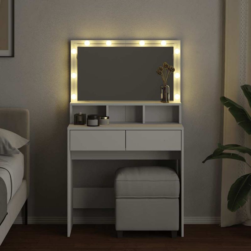 Тоалетката е страхотно допълнение към декора на вашата спалня, като същевременно държи козметиката ви подръка! Стабилен и издръжлив материал: Инженерната дървесина е издръжлив и стабилен материал с гладка повърхност, която е устойчива на влага, изкривяване и разцепване, което я прави надежден избор за различни проекти.Достатъчно място за съхранение: Масата за гримиране с 2 чекмеджета и 3 отделения предлага достатъчно място за съхранение, за да държите вашите различни ежедневни неща добре организирани и леснодостъпни.Помощно огледало: Включеното красиво огледало осигурява ясна видимост за нанасяне на грим и добавя елегантен щрих към тоалетката.LED осветление: Козметичната масичка разполага с LED крушки с USB, които лесно превключват режимите от топло към студено бяло. Включените светодиоди около огледалото също така озаряват вашата красота. Внимание:За да предотвратите преобръщане, този продукт трябва да се използва с предоставеното устройство за закрепване на стена.