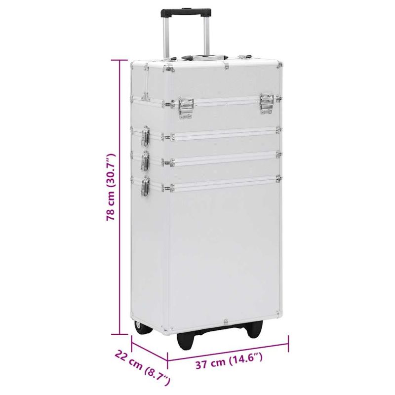 Нашият куфар за грим на колелца е идеалното решение за поддържане на козметиката ви добре подредена. Просто опаковайте всичко необходимо в този практичен куфар за грим и го вземете със себе си! Изработен от дърво, ABS листове и алуминий, този куфар за грим лесно ще съхранява козметиката ви и ще я поддържа в перфектно състояние. Този куфар за грим разполага с 4 нива и разтегаеми тави в горната част, осигуряващи достатъчно място за съхранение на вашите козметични средства и продукти за красота. Той разполага с 4 подвижни колелца, които улесняват преместването му и транспортирането му с вас, където и да отидете!