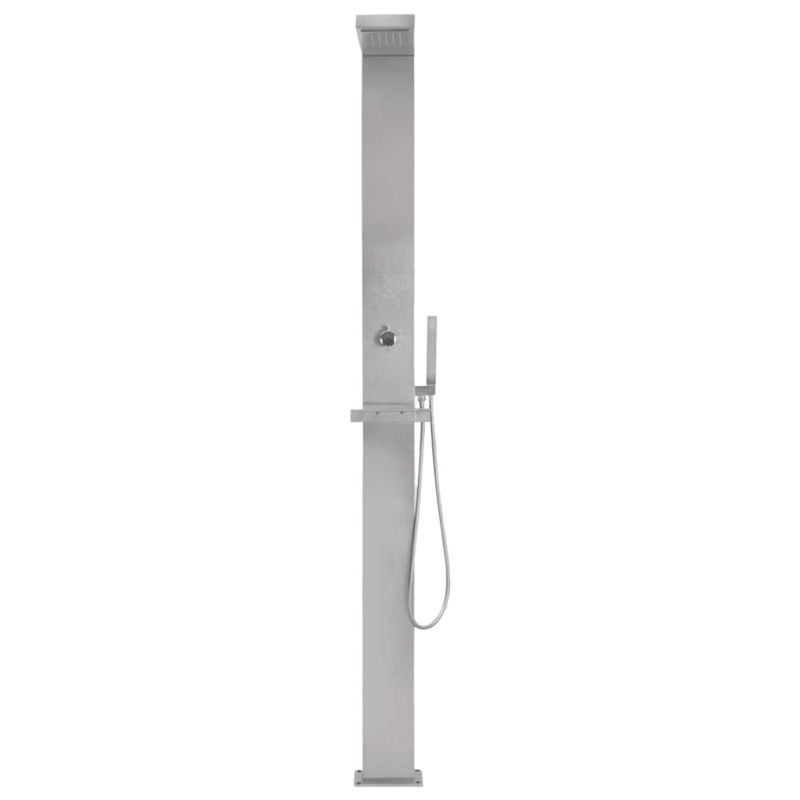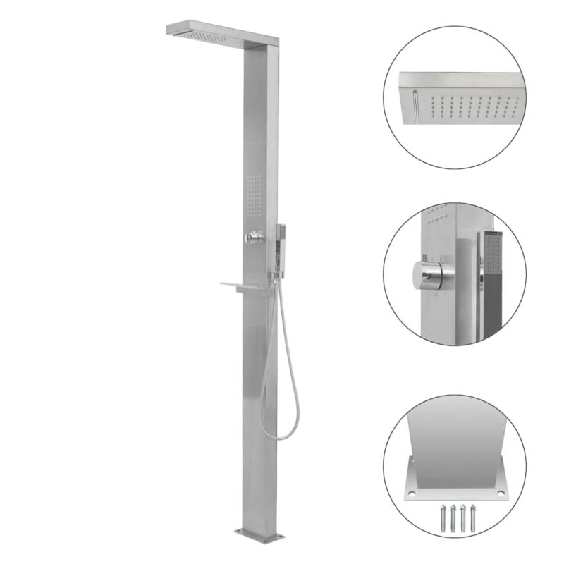 Нашата многофункционална душ панелна система има стилен дизайн и ще бъде чудесно допълнение към вашата градина и двор. Душ системата е изработена от издържлива неръждаема стомана с матово покритие и има красив извит дизайн. Тя се отличава с две функции: дъжд и ръчна душ глава, която лесно може да се превключи с копче. Потопете се в истински релаксиращ душ и се насладете на модерния стил на тази красива душ панелна система! Душ панелната система се сглобява лесно. Забележка: Продуктът не е соларен и не е душ панел с гореща вода.