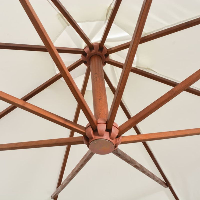 Този елегантен, висококачествен дървен висящ градински чадър е идеалният избор за създаване на сянка и защита от вредните ултравиолетови лъчи на слънцето, докато си почивате със семейството си на терасата, вътрешния двор или в градината. Освен това той ще бъде впечатляващо допълнение към вашето външно жилищно пространство. Изработено от устойчив на UV лъчи и цветен полиестерен плат, покривалото на чадъра ви осигурява оптимална защита от слънцето. Здравият дървен стълб, заедно с 8 стабилни бамбукови ребра и кръстосана основа, осигуряват голяма стабилност и издръжливост. Дървеният прът е разположен извън сенника, така че да не пречи на пространството под чадъра. Градинският чадър може лесно да се отваря и затваря благодарение на манивелата.