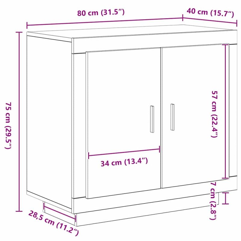 Този страничен шкаф съчетава стил и функционалност, идеален за съвременни всекидневни. С правоъгълната си форма и минималистичен дизайн, той предлага много място за съхранение и подобрява визията на интериора с чисти линии. Тази многофункционална единица е подходяща за съхранение на трапезни принадлежности, аксесоари или офис материали, отговаряща на разнообразни нужди. Изграждане от инженерна дървесина: Този шкаф е от качествено инженерно дърво, което е здраво и с гладък завършек. Дървото е устойчиво на износване и внася съвременен вид, съвместимо с всякакви интериори. Ефективни плоски врати: Има плоски врати, които се отварят лесно и предлагат достъп до обширното вътрешно пространство, поддържайки реда. Прътове от стомана: С метални дръжки в черен цвят, шкафът предлага удобно захващане и добавя елегантност към дизайна. Обширно пространство за съхранение: С много място, тази единица е идеална за организиране на домашни вещи, включително прибори и офис материали. Изисквания за сглобяване и поддръжка: Сглобяването е лесно с двама души и отвертка. Поддържането е просто – избършете с суха кърпа, за да му запазите вида.