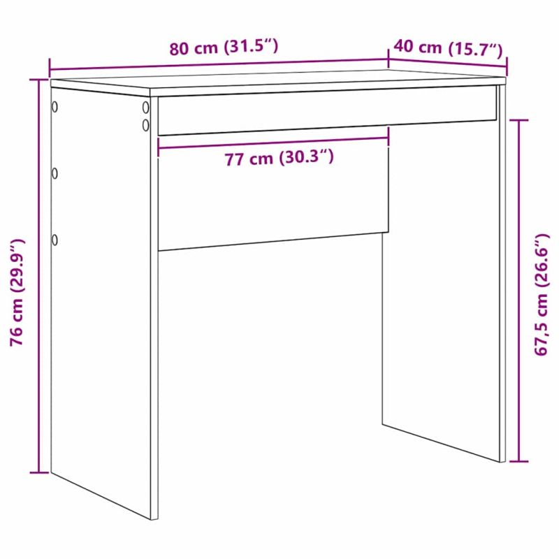 Това компактно бюро за писане е проектирано с внимание към съвременната работа и предлага функционалност, съчетана с красив дизайн. С минималистичен вид и чисти линии, то е идеален избор за малки офиси или домашни работни места, подобряващи пространството без да го натоварват. Структура от качествена дървесина Супер здрава рамка, направена от инженерна дървесина, която гарантира стабилност и дълготрайна употреба. Материалът е устойчив на износване, идеален за ежедневно ползване, като запазва елегантността и функционалността си. Ефективна работна повърхност Плотът без усилия побира компютри и различни нужни вещи, оптимизирайки пространството. Идеален е за лаптопи, монитори и офис принадлежности, като предоставя отлично изживяване за продуктивна работа. Подходящ размер за всяко помещение Бюрото се вписва отлично в всекидневни, офиси и кабинети, лесно се интегрира в различни интериори. Компактните му размери и съвременен дизайн го правят идеално за градски апартаменти, осигурявайки място в съвременна обстановка. Лесно сглобяване Доставя се компактно с ясни указания, изискващи само отвертка. Проектирано за комфорт, бързото сглобяване го прави подходящо за всеки, който иска да организира пространството си бързо и без затруднения. Грижа и поддръжка Поддръжката е изключително лесна — просто го избърсвайте с влажна кърпа, за да запазите стилната му повърхност. Проектирано за вътрешна употреба, бюрото остава устойчиво на ежедневните офис дейности.