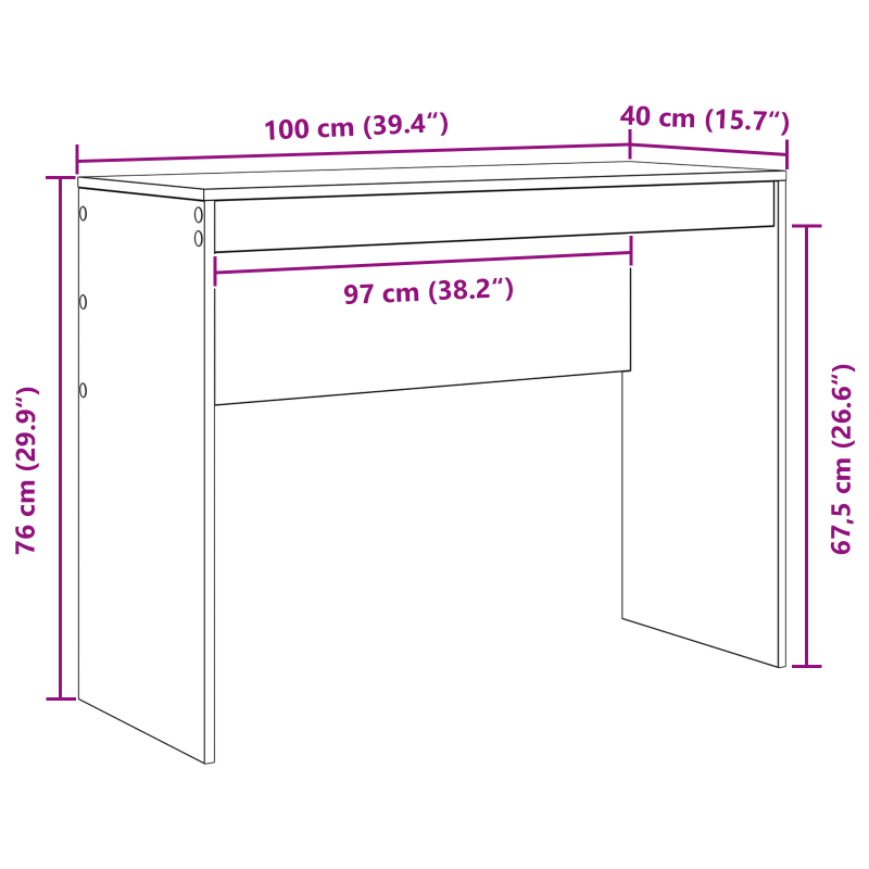 Това компактно бюро за писане е проектирано с внимание към съвременната работа и предлага функционалност, съчетана с красив дизайн. С минималистичен вид и чисти линии, то е идеален избор за малки офиси или домашни работни места, подобряващи пространството без да го натоварват. Структура от качествена дървесина Супер здрава рамка, направена от инженерна дървесина, която гарантира стабилност и дълготрайна употреба. Материалът е устойчив на износване, идеален за ежедневно ползване, като запазва елегантността и функционалността си. Ефективна работна повърхност Плотът без усилия побира компютри и различни нужни вещи, оптимизирайки пространството. Идеален е за лаптопи, монитори и офис принадлежности, като предоставя отлично изживяване за продуктивна работа. Подходящ размер за всяко помещение Бюрото се вписва отлично в всекидневни, офиси и кабинети, лесно се интегрира в различни интериори. Компактните му размери и съвременен дизайн го правят идеално за градски апартаменти, осигурявайки място в съвременна обстановка. Лесно сглобяване Доставя се компактно с ясни указания, изискващи само отвертка. Проектирано за комфорт, бързото сглобяване го прави подходящо за всеки, който иска да организира пространството си бързо и без затруднения. Грижа и поддръжка Поддръжката е изключително лесна — просто го избърсвайте с влажна кърпа, за да запазите стилната му повърхност. Проектирано за вътрешна употреба, бюрото остава устойчиво на ежедневните офис дейности.