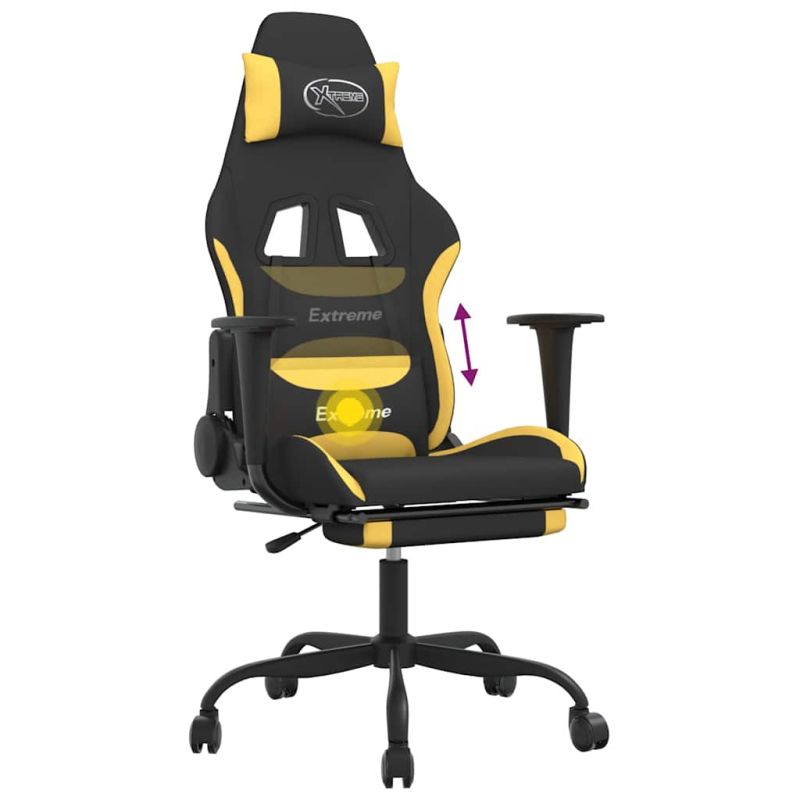 Масажен гейминг стол с опора за крака, черно и жълто, плат