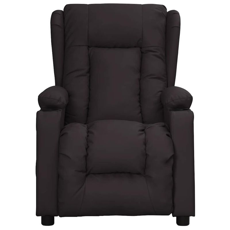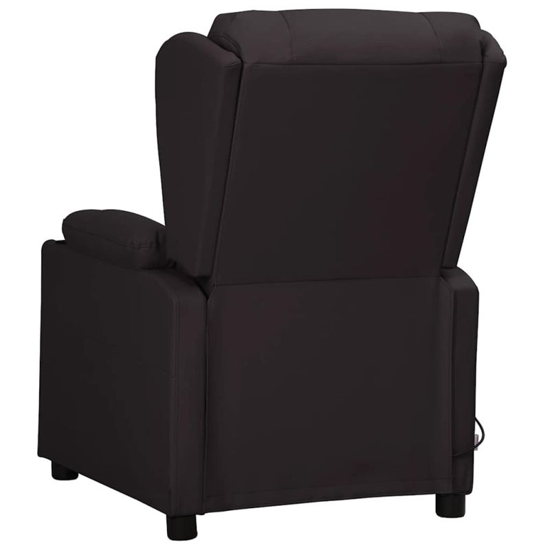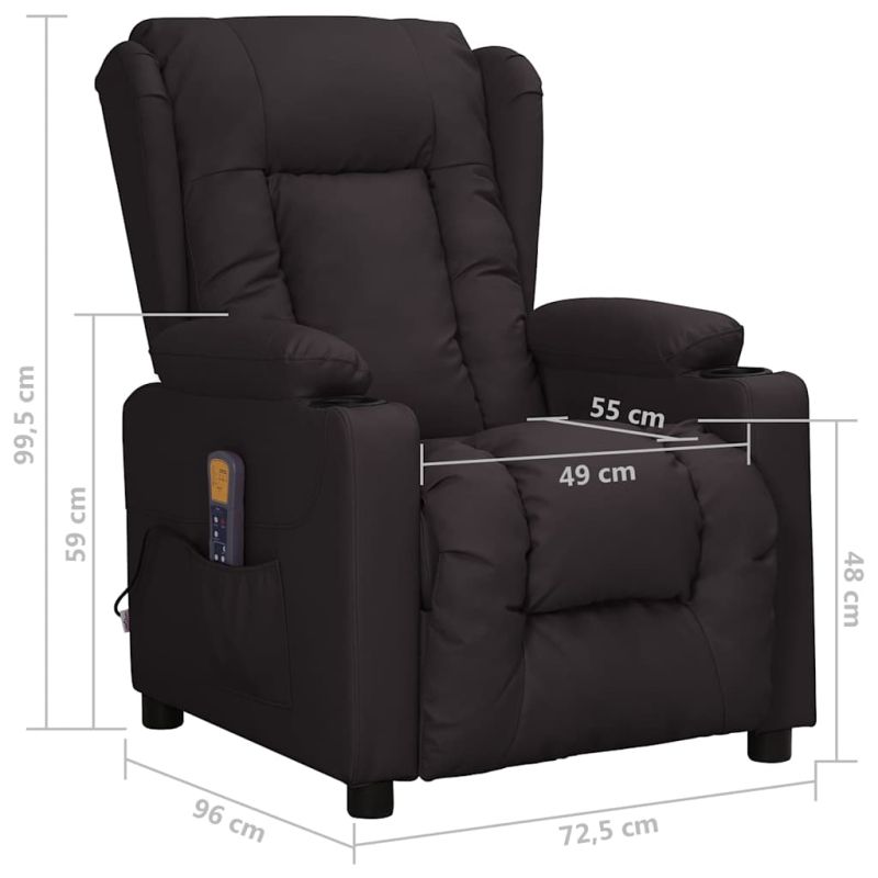 Облегнете се и се отпуснете в този изключително комфортен масажен стол! Функция за ръчно накланяне: Накланящият се стол е специално проектиран с 3 позиции на наклон, така че да можете да регулирате ръчно облегалката и поставката за крака според вашето удобство.Функция за вибрация: Представените 6 масажни точки ви позволяват да изпитате по-целенасочен масаж. Освен това включеното ръчно управление ви позволява да избирате различни програми за масаж. Функцията за масаж се захранва от USB конектора, но сертифицираният 5V USB източник на захранване не е включен.Удобно седене: Дебело подплатената седалка, облегалката и широките подлакътници, покрити с изкуствена кожа, осигуряват уютно и топло усещане, което ви кара да се чувствате като в прегръдка, докато седите. Изкуствената кожа е много издръжлив материал. Устойчива е на петна, което я прави лесна за почистване с влажна кърпа. Гладката повърхност също така придава луксозен вид и красотата на истинската кожа.Здрава и стабилна рамка: Рамката, изработена от дърво и метал, осигурява здрава структура и стабилност. Този накланящ се фотьойл е удобен и издръжлив. Този продукт се захранва с DC 5V, но сертифицираният 5V USB източник на захранване не е включен в комплекта. Моля, обърнете внимание, че трябва да използвате само сертифициран вход DC 5V. По-високото напрежение може да доведе до прегряване и да повреди устройството, както и до потенциален риск от прегряване и пожар.