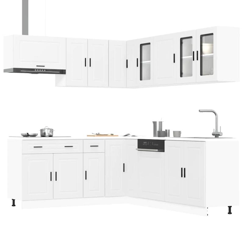 Този комплект кухненски шкафове от 11 части с елегантния си дизайн оптимизира кухненското ви пространство и осигурява достатъчно място за съхранение на вещите ви! Стабилен и издръжлив материал: Инженерната дървесина е издръжлив и стабилен материал с гладка повърхност, която е устойчива на влага, изкривяване и разцепване, което я прави надежден избор за различни проекти.Голямо пространство за съхранение: Комплектът кухненски шкафове има много отделения и предлага достатъчно място за съхранение на купи, чинии, тенджери и други кухненски уреди.Регулируеми крачета: Долните шкафове са снабдени с регулируеми крачета, чиято височина може да се регулира според разположението на кухнята.Лесна поддръжка: Благодарение на гладката си повърхност тези кухненски шкафове се почистват лесно с влажна кърпа и изискват по-малко поддръжка. Внимание:За да предотвратите преобръщане, този продукт трябва да се използва с предоставеното устройство за закрепване на стена. Добре е да се знае:Винт(ове) и щепсел(и) за вътрешността на стената не са включени. Търсете и използвайте винт(ове) и дюбел(и), подходящи за вашите стени. Ако не сте сигурни, потърсете професионална помощ. Прочетете и следвайте внимателно всяка стъпка от инструкциите.Работният плот, мивката и смесителят не са включени в доставката.