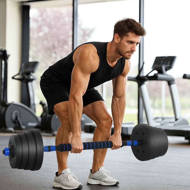 Начало Спорт и фитнес Фитнес и упражнения Вдигане на тежести Свободни тежести 2-в-1 комплект дъмбели и щанга 30кг 30кг Черен и син