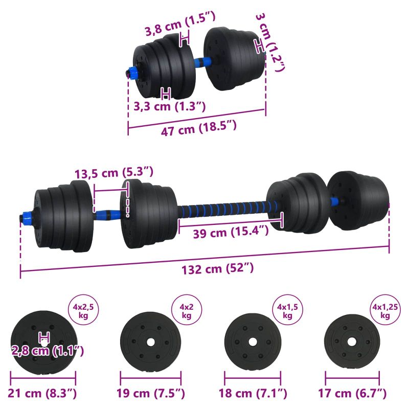 • 4 x дъмбелна плоча (2,5 кг): Ø21 x 3,8 см (Диаметър x Д)