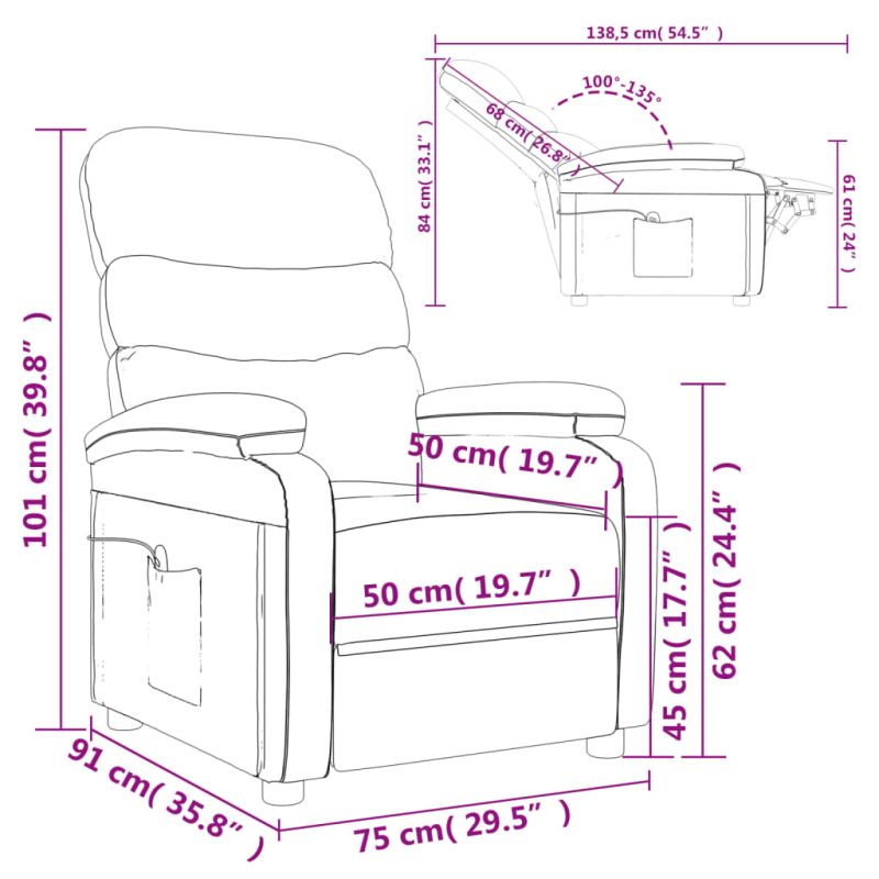 Облегнете се и се отпуснете в този изключително комфортен масажен стол! Функция за ръчно накланяне: Накланящият се стол е специално проектиран с 3 позиции на наклон, така че да можете да регулирате ръчно облегалката и поставката за крака според вашето удобство.Функция за вибрация: Представените 6 масажни точки ви позволяват да изпитате по-целенасочен масаж. Освен това включеното ръчно управление ви позволява да избирате различни програми за масаж. Функцията за масаж се захранва от USB конектор, който изисква сертифициран 5V USB захранващ източник (не е включен).Удобно седене: Дебело подплатената седалка, облегалката и широките подлакътници, покрити с изкуствена кожа, осигуряват уютно и топло усещане, което ви кара да се чувствате като в прегръдка, докато седите. Изкуствената кожа е много издръжлив материал. Устойчива е на петна, което я прави лесна за почистване с влажна кърпа. Гладката повърхност също така придава луксозен вид и красотата на истинската кожа.Здрава и стабилна рамка: Рамката, изработена от дърво и метал, осигурява здрава структура и стабилност. Този накланящ се фотьойл е удобен и издръжлив. Този продукт се захранва с DC 5V, но сертифицираният 5V USB източник на захранване не е включен в комплекта. Моля, обърнете внимание, че трябва да използвате само сертифициран вход DC 5V. По-високото напрежение може да доведе до прегряване и да повреди устройството, както и до потенциален риск от прегряване и пожар.