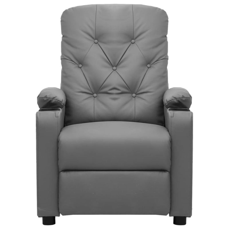 Облегнете се и се отпуснете в този изключително комфортен масажен стол! Функция за ръчно накланяне: Накланящият се стол е специално проектиран с 3 позиции на наклон, така че да можете да регулирате ръчно облегалката и поставката за крака според вашето удобство.Функция за вибрация: Представените 6 масажни точки ви позволяват да изпитате по-целенасочен масаж. Освен това включеното ръчно управление ви позволява да избирате различни програми за масаж. Функцията за масаж се захранва от USB конектора, но сертифицираният 5V USB източник на захранване не е включен.Удобно седене: Дебело подплатената седалка, облегалката и широките подлакътници, покрити с изкуствена кожа, осигуряват уютно и топло усещане, което ви кара да се чувствате като в прегръдка, докато седите. Изкуствената кожа е много издръжлив материал. Устойчива е на петна, което я прави лесна за почистване с влажна кърпа. Гладката повърхност също така придава луксозен вид и красотата на истинската кожа.Здрава и стабилна рамка: Рамката, изработена от дърво и метал, осигурява здрава структура и стабилност. Този накланящ се фотьойл е удобен и издръжлив.
