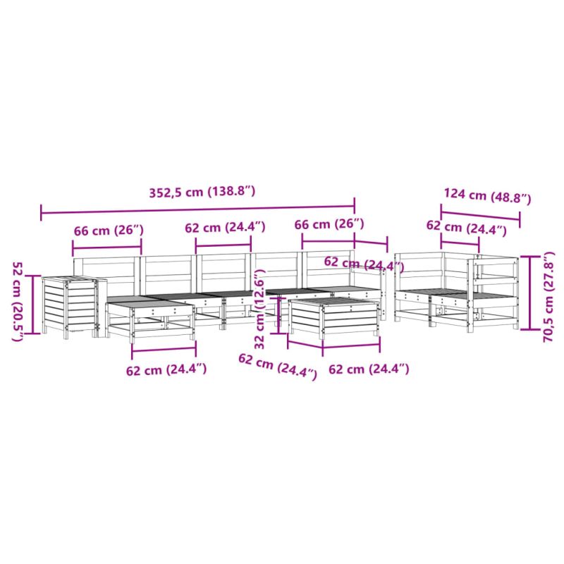 Този дървен градински лаундж комплект с летвен дизайн ще бъде чудесно допълнение към вашата градина, вътрешен двор или тераса, за да се насладите на уютно време със семейството или приятелите си. Здрав и издръжлив материал: Масивната борова дървесина е известна със своята здравина и издръжливост. Нейните прави зърна и отличителни възли допринасят за рустик чара ѝ. Тя е импрегнирана с консервиращ разтвор и е подложена на автоклавно третиране, което повишава устойчивостта ѝ на гниене и атмосферни влияния. Добро проветряване и предотвратяване на образуването на натрупвания: Дизайнът на ламелите спомага за оптимален въздушен поток и ефективно предотвратява събирането на вода, като осигурява суха и удобна седалка. Разнообразна употреба: Градинската табуретка за крака може да се използва не само за сядане или отпускане на краката ви, но може да се използва и като масичка за кафе, за да държите вашите напитки, храна и други декорации. Удобна странична масичка: Тази външна мебел разполага със сгъваема странична масичка с газова пружина на подлакътника, осигуряваща удобно място, за да държите най-важните неща леснодостъпни. Модулен дизайн: Този комплект външни мебели има модулен дизайн, което го прави напълно гъвкав и лесен за преместване, така че можете да създадете персонализирана подредба на външни мебели. Добре е да се знае:За да сте сигурни, че вашите външни мебели ще останат красиви, ви препоръчваме да ги защитите с водоустойчиво покривало. Максимално 110 кг на седалка.
