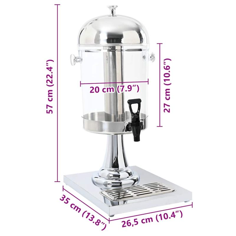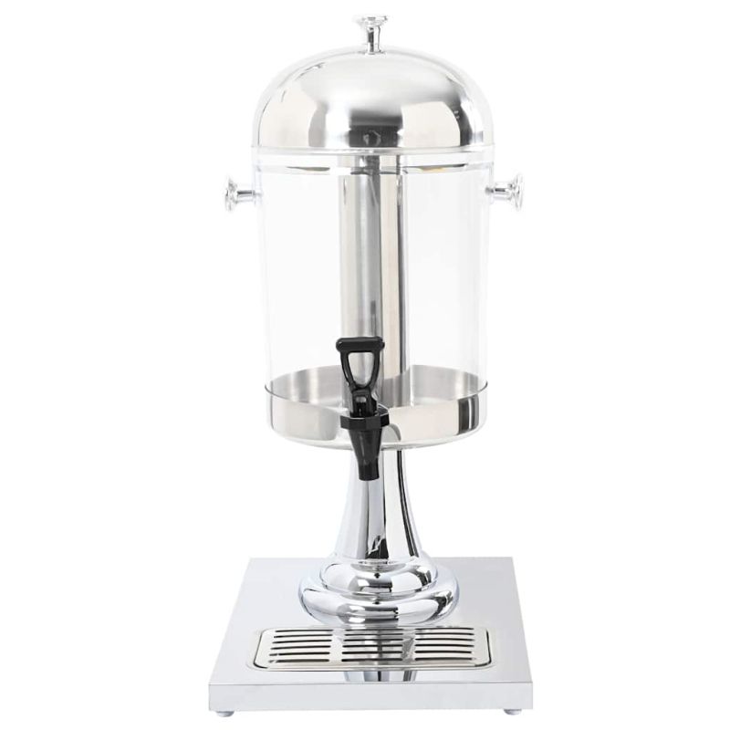 Този диспенсър за сокове е изискано решение за сервиране на охладен сок или други напитки към шведски маси, барбекюта и други събития. Контейнерът за сок е с капацитет 8 литра. Диспенсърът за напитки с кранче е подходящ за чаши с максимална височина 15,5 см. Централният цилиндър може да се напълни с кубчета лед за охлаждане на напитките. Тавата за събиране на капките събира разлетия сок и може лесно да бъде извадена и изпразнена. Диспенсърът за напитки има рамка от неръждаема стомана и прозрачен пластмасов контейнер, което го прави издържлив и лесен за почистване.