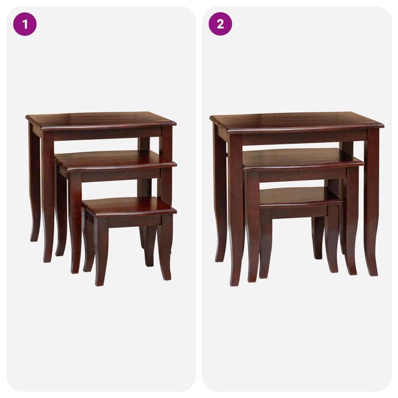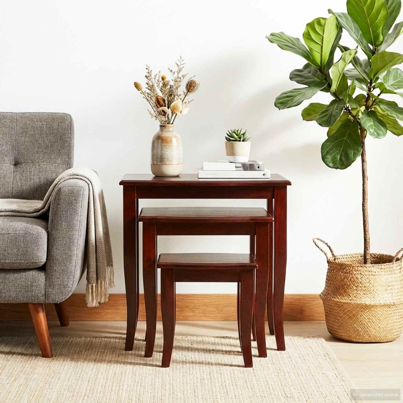 Този стилен комплект от класически масички за стифиране съчетава функционалност и красота. Проектирани за да бъдат вечни в дома ви, те предлагат универсалност в малки пространства, като всекидневни и спални. Всяка масичка се струпва под по-голямата, което ги прави подходящи за места с ограничено пространство. С класическия си дизайн, те придават изискан вид на вашия дом, с елегантност и сдържаност. Махагоновата дървесина добавя топлина и уют, без проблем се вписва в традиционни или съвременни интериори. Функционалността им позволява да бъдат използвани за сервиране на напитки, показване на декорации или дори за импровизирани работни пространства. Солидна махагонова изработка: Този комплект от масички е изработен от качествена, солидна махагонова дървесина, позната със своята здравина и красиви шарки. Внимателното изпълнение гарантира дълготрайност при ежедневна употреба, без да губи привлекателния си вид. Функционален дизайн: Те са проектирани да се вписват едно под друго, предлагайки гъвкавост. Използвайте ги заедно на големи събирания или поотделно, когато пространството е ограничено. Тази функция запазва елегантността им и увеличава практичността. Лесна поддръжка: Масичките са с повърхност, устойчива на ежедневно износване и лесна за почистване. Просто избършете с мека, суха кърпа, и те ще изглеждат страхотно. Устойчивостта им на почистващи химикали прави поддръжката лесна. Не изисква сглобяване: Просто ги разопаковайте и ги поставете в помещението си, без притеснения за инструменти или допълнителни стъпки. Дизайнът акцентира на практичността, позволяваща веднага използване след доставка. Извечна привлекателност: С класически стил, тези масички се вписват без проблем в различни декори. Дали в изискана всекидневна или уютна спалня, те придават фино излъчване на всяка среда.