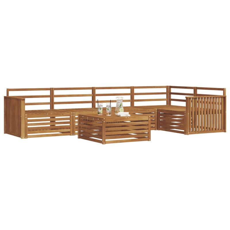 Комплектът градински мебели обединява стил и функция, създавайки впечатляващ акцент в градината или на терасата. Със съвременния си дизайн, определен от чисти линии и простички детайли, добавя елегантност и е идеален за отдих и социални срещи. Направен е от масивна акациева дървесина, което гарантира издръжливост и дълготрайна привлекателност, правейки го чудесен избор за тези, които търсят практичност и стил в градинската мебелировка. Издръжливо масивно акациево дърво: Изработен от плътна акациева дървесина, този комплект е снабден със здравина и устойчивост на външната среда. Здравата конструкция предлага надеждност и дълготрайна стабилност, а топлият естествен тон добавя допълнителен чар на всяка градина или тераса. Дизайн, устойчив на времето: Този комплект мебели за открито има лакирана повърхност, която осигурява допълнителна защита от слънце, дъжд и всякакви метеорологични условия. Полираното покритие помага за запазване на външния вид и функцията, осигурявайки дълготрайна издръжливост за вашата градина, тераса или двор. Компоненти и дизайн: Всеки елемент, от подлакътниците до облегалките, е създаден с внимание към стил и комфорт. Подпорният дизайн предоставя допълнителна удобност, а сплотеният вид осигурява визуално хармонично усещане, подходящо за различни поводи на открито. Комфорт и гъвкавост: Модулният дизайн позволява различни настройки, подходящи за разнообразни пространства и нужди. Идеален е за релаксация, социални събирания или спокойно четене; комплектът лесно се адаптира към всяка открита среда, като оптимизира комфорта и практичността. Лесна поддръжка: За да поддържате мебелите в добро състояние, просто ги почиствайте с мокра кърпа и избягвайте агресивни почистващи средства. Редовната грижа спомага за запазване на външния вид и удължава живота на мебелите.