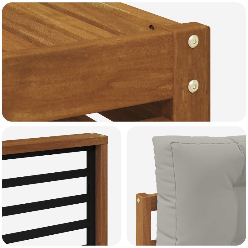 Комплектът градински мебели обединява стил и функция, създавайки впечатляващ акцент в градината или на терасата. Със съвременния си дизайн, определен от чисти линии и простички детайли, добавя елегантност и е идеален за отдих и социални срещи. Направен е от масивна акациева дървесина, което гарантира издръжливост и дълготрайна привлекателност, правейки го чудесен избор за тези, които търсят практичност и стил в градинската мебелировка. Издръжливо масивно акациево дърво: Изработен от плътна акациева дървесина, този комплект е снабден със здравина и устойчивост на външната среда. Здравата конструкция предлага надеждност и дълготрайна стабилност, а топлият естествен тон добавя допълнителен чар на всяка градина или тераса. Дизайн, устойчив на времето: Този комплект мебели за открито има лакирана повърхност, която осигурява допълнителна защита от слънце, дъжд и всякакви метеорологични условия. Полираното покритие помага за запазване на външния вид и функцията, осигурявайки дълготрайна издръжливост за вашата градина, тераса или двор. Компоненти и дизайн: Всеки елемент, от подлакътниците до облегалките, е създаден с внимание към стил и комфорт. Подпорният дизайн предоставя допълнителна удобност, а сплотеният вид осигурява визуално хармонично усещане, подходящо за различни поводи на открито. Комфорт и гъвкавост: Модулният дизайн позволява различни настройки, подходящи за разнообразни пространства и нужди. Идеален е за релаксация, социални събирания или спокойно четене; комплектът лесно се адаптира към всяка открита среда, като оптимизира комфорта и практичността. Лесна поддръжка: За да поддържате мебелите в добро състояние, просто ги почиствайте с мокра кърпа и избягвайте агресивни почистващи средства. Редовната грижа спомага за запазване на външния вид и удължава живота на мебелите.
