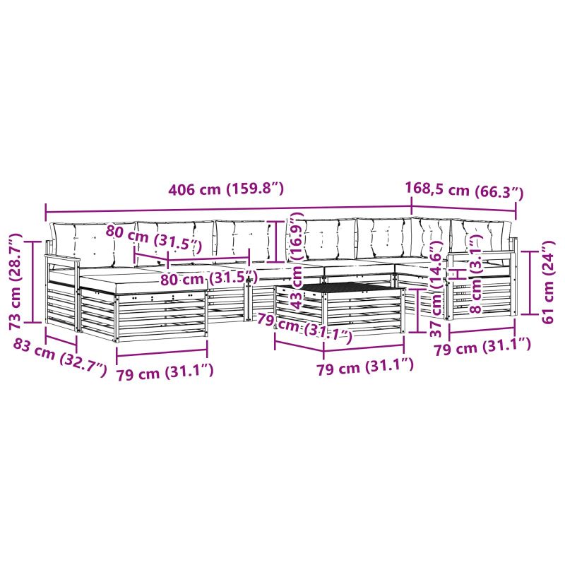 Този секционен диван е стилен и универсален, идеален за преобразуване на вашата градина или патио в удобно място. С модерен вид и чисти линии, той се интегрира безпроблемно в откритите пространства и е перфектен за релаксация. Комбинира естествени дървесни тонове с здраво строителство, служейки и като красиво решение за сядане. Качество на изработката: Изработен от масивна акациева дървесина, този комплект е с богат кафяв цвят, излъчващ елегантност и топлина. Висококачественият материал е здрав и е устойчив на климатични влияния, което го прави идеален за дългосрочна употреба на открито. Вградена гъвкавост: Модулният дизайн позволява адаптиране на компонентите спрямо пространството или повода. Подходящ е както за големи събирания, така и за уютни вечери. Стил и практичност: С решетъчен гръб и минималистични подпори, диванът предлага баланс между стил и лесна поддръжка. Допълващи компоненти: Изработен е с решетъчни гръбове и здрави подпори от масивна акациева дървесина, предпазващи елегантността му. Грижи и поддръжка: Сетът изисква само забърсване с влажна кърпа за поддържане на вида си и гарантира дълготрайност.