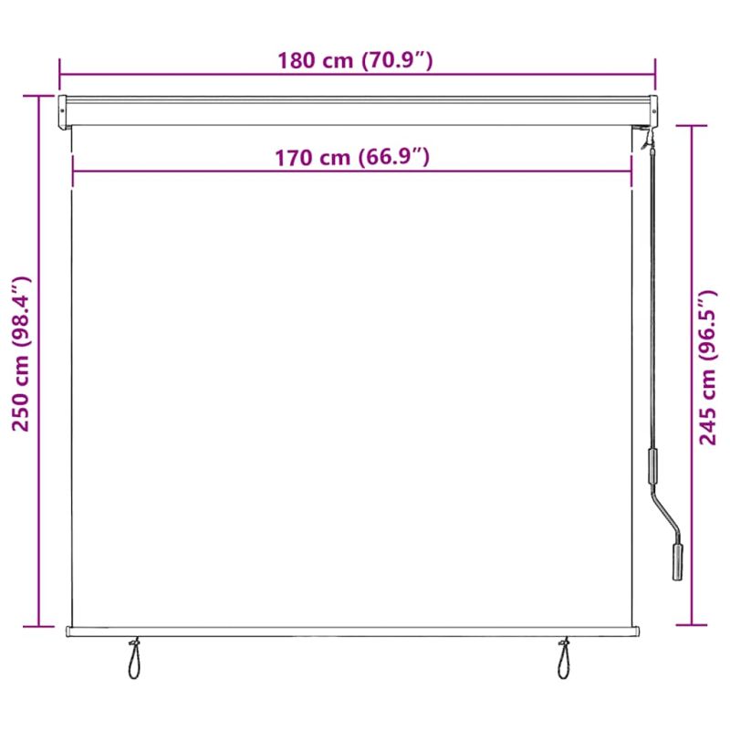 Търсите ли външен ролетен сенник за вашия балкон, градина, вътрешен двор или тераса? Тази ръчно управлявана външна ролетна щора ще бъде оптималният избор за вас! Изработена от дишаща полиестерна тъкан с PA покритие, вертикалната тента позволява добра циркулация на въздуха и може да блокира повечето вредни слънчеви лъчи. Тя може да осигури поверителност през деня в редица приложения на открито, включващи вътрешния двор, градината и др. Алуминиевата предна шина и стоманената касета предотвратяват провисване и огъване. Благодарение на ръчната манивела, ще можете лесно да разтваряте и прибирате щората. Външната ролетна щора се сглобява лесно.