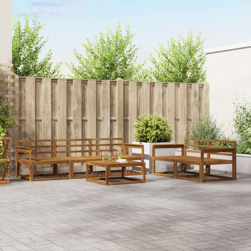 Този модерен комплект открит ъглов диван е точно това, от което се нуждаете, за да направите вашата градина, патио или край басейн централно място. Със своя стилен дизайн и удачно съчетание на удоволствие и функция, кафявите му тонове и скрития гръб придават лукс на откритите пространства, създавайки перфектна зона за сядане за всякакви събития или тихи моменти. Независимо дали е под чадър или на слънце, този комплект ще преобрази всяка среда със своето безвремие, канейки всеки да се отпусне и да се наслади на удоволствието от откритото. Масивна акациева дървесина: Направен от първокласна масивна акациева дървесина, този комплект дивани излъчва естествена красота и здравина. С доказаната си устойчивост и красиви зърна, акациевата дървесина е идеална за открито, тъй като е устойчива на атмосферни условия и ежедневна употреба. Природната лъскавина на дървесината добавя елегантност и не изисква много поддръжка, което я прави сладък избор за всеки стилен дом. Слатен гръб: С елегантен слатен гръб, този комплект дивани комбинира красота и удобство. Този дизайн позволява циркулация на въздуха и придава по-освежаващо усещане на вашето пространство. Поддържащата облегалка предлага комфорт, а красивия вид създава уютна атмосфера на открито, перфектна за развлечения или релакс. Фиксирана слатена рамка: Здравата и фиксирана слатена рамка осигурява стабилност и надеждност, които ще ви служат години напред. Този дизайн е перфектен за открито, където е нужна здрава опора. Конструкцията на рамката допълва стила на дивана, създавайки единно визуално излъчване, което акцентира на здравината и съвременния вид. Устойчив на времето: Проектиран да издържа на теста на времето, този комплект е направен да понася различни метеорологични условия. От слънчеви следобеди около басейна до ветровити вечери в градината, материалите и дизайнът осигуряват допълнителна защита, така че диванът да остане удобен и привлекателен през целия сезон. Модулна конфигурация: Модулният дизайн на комплета ви позволява да настроите подредбата по ваш вкус, в зависимост от настроението или повода. Можете лесно да създадете интимна обстановка или да разширите местата за сядане. Тази гъвкавост осигурява комфорт и позволява адаптация към нуждите на вашия начин на живот, добавяйки стил и функционалност.