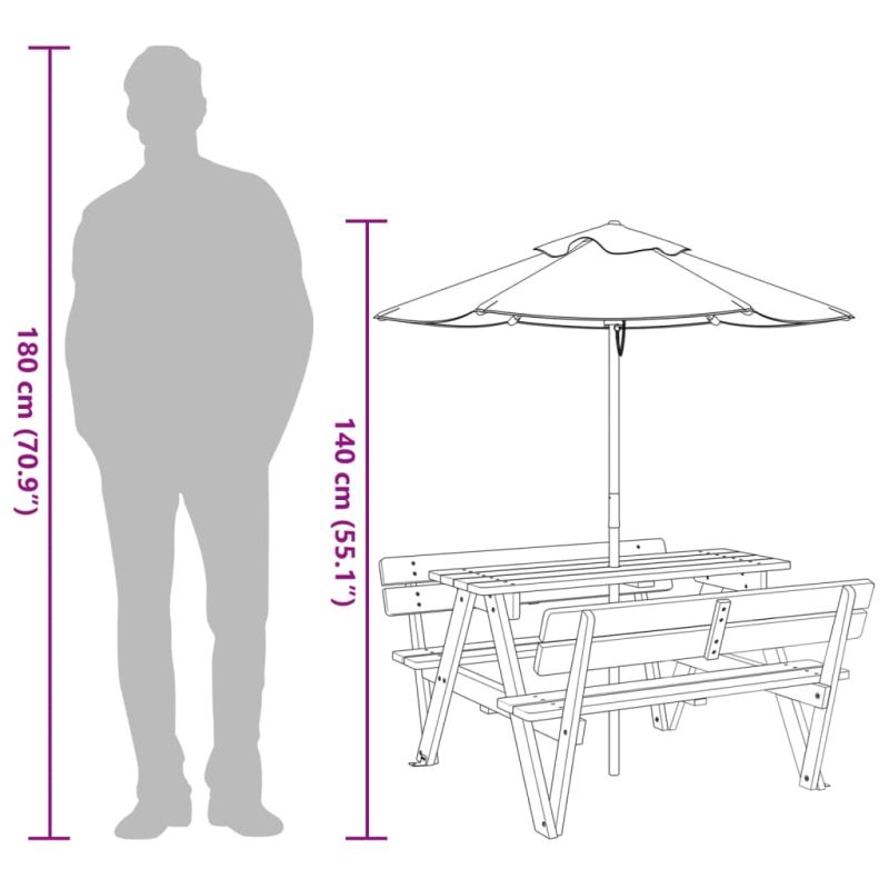 Тази маса за пикник с чадър е идеална за вътрешни дворове, градини и открити пространства, като осигурява удобно и привлекателно място за почивка и забавление на децата и техните приятели. Комплект маса и пейки 2-в-1: Масата за пикник с пейки е идеална за детски партита и събирания, тъй като осигурява достатъчно място за храна, напитки и аксесоари, както и удобни места за сядане, за да могат децата да се наслаждават на детските си спомени.Надежден и стабилен материал: Тази маса за пикник е изработена от масивна чамова дървесина, което гарантира стабилност, издръжливост и дълготрайност.Здрава и стабилна структура: Тази маса за пикник има "W"-образна структура, която осигурява стабилност и безопасност за децата, занимаващи се с различни дейности.Защита от слънце и дъжд: Изработен от издръжлив полиестер, външният чадър предлага защита от слънце и дъжд, създавайки идеално място за децата, където да се наслаждават на времето на открито. Добре е да се знае:Този продукт не е подходящ за употреба при лоши метеорологични условия, като силен вятър, силен дъжд, сняг, бури и др. Предупреждение: НЕ поставяйте този продукт близо до прозорец, тъй като той може да бъде използван като стълба от деца и те да паднат от прозореца. Бъдете внимателни по отношение на риска от открити огньове и други източници на силна топлина в близост до продукта. НЕ поставяйте този продукт близо до прозорец, където шнуровете от щорите или завесите могат да удушат дете. Предупреждение! Да се сглобява единствено от възрастни. Съхранявайте продукта и всички негови части далеч от деца до момента на сглобяването. Уверете се, че сте осъзнали цялата отговорност, тъй като несглобеният продукт съдържа малки части и потенциално опасни остри ръбове. Предупреждение! Да се използва под директния надзор на възрастни. Предупреждение! Максималната товароносимост е 80 кг. Предупреждение! Този продукт е подходящ само за деца над 3-годишна възраст.
