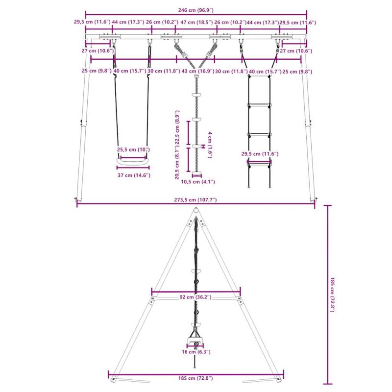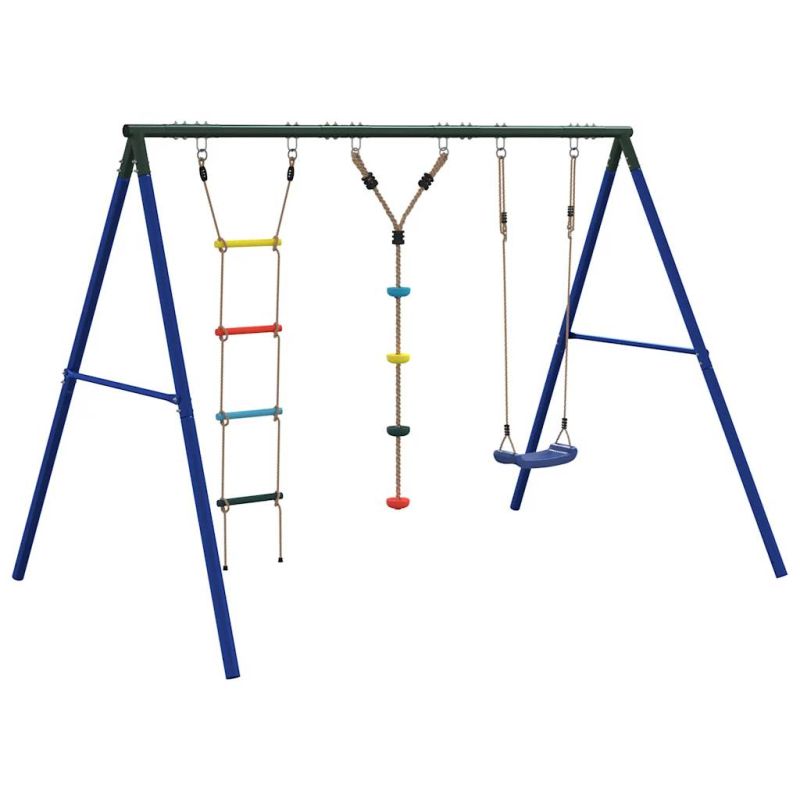 Превърнете градината си в детска площадка за вашите деца с тази външна люлка! Център за забавни дейности: Този комплект детски люлки включва 3 различни опции за игра с люлка седалка, люлка с дискове и стълба за катерене. Така децата могат да се люлеят и катерят до насита.Издръжлива метална рамка: Тази рамка за люлка е изработена от боядисани стоманени тръби, които са устойчиви на ръжда, изключително здрави и устойчиви на деформация, осигурявайки отлична стабилност и издръжливост. А-образната структура предлага здрава опора без никакво колебание.Регулируема седалка за люлка: Тази градинска люлка е проектирана да расте с вашето дете, което я прави подходяща както за малки, така и за подрастващи деца. Чрез регулиране на дължината на въжето можете лесно да се приспособите към променящите се нужди на вашето дете.Многофункционални играчки за открито за деца: Тази градинска люлка помага на децата да подобрят своя баланс, координация, ловкост, сила и издръжливост, като същевременно предоставя различни начини за игра и упражнения.Широки приложения: Тази рамка за люлка може да се постави на различни места като градини, задни дворове, детски градини, детски площадки и др. Добре е да се знае:С оглед на безопасността всяка люлка трябва да се използва само от едно дете. Предупреждение. Не е подходящ за деца под 3 години. Само за домашна употреба. GPSR