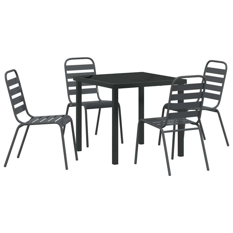 Този комплект за хранене в промишлен стил добавя уникален вид на всяка градина или тераса с формата си и здравото си строителство. Проектиран е за външна употреба, има минималистичен, но функционален дизайн, който е в тон с модерната естетика. С привлекателен антрацитен нюанс и изискан вид, комплектът се превръща в идеалната акцентна част за събирания или уютни вечери, като подобрява опита ви на открито с елегантност и практичност. Материали Комплектът с антрацитен цвят е направен от прахово боядисана стомана, което осигурява здравина и отлично представяне навън. Масата от закалено стъкло добавя лукс и предлага надеждна повърхност, устойчива на различни климатични условия, което го прави перфектен както за стил, така и за функционалност. Включени компоненти Спокойната комбинация от елементи от прахово боядисана стомана придава цялостен вид. Включва стилни крака и рамка, които придават индустриален стил и допълват съвременния външен интериор. Тази конструкция осигурява стабилност и комфорт при хранене. Характеристики Проектиран за външен вид, комплектът е устойчив на сезонни износвания. Праховото покритие добавя защитен слой, който повишава издръжливостта и естетическата привлекателност, идеален за релаксиращи вечери в градината с близки и приятели. Препоръчителни употреби Проектиран е за градини и тераси, идеален за пролетта и лятото. Неговият многопрофилен дизайн съчетава формални хранителни изживявания или уютни събирания, без проблеми се влива в различни среда, осигурявайки функционалност и стил. Грижи и поддръжка За максимална издръжливост, покривайте комплекта, когато не го ползвате. Въпреки здравата си конструкция, редовното покритие в неактивните сезони увеличава дълготрайността му и му помага да бъде мултифункционална част от вашето открито пространство.