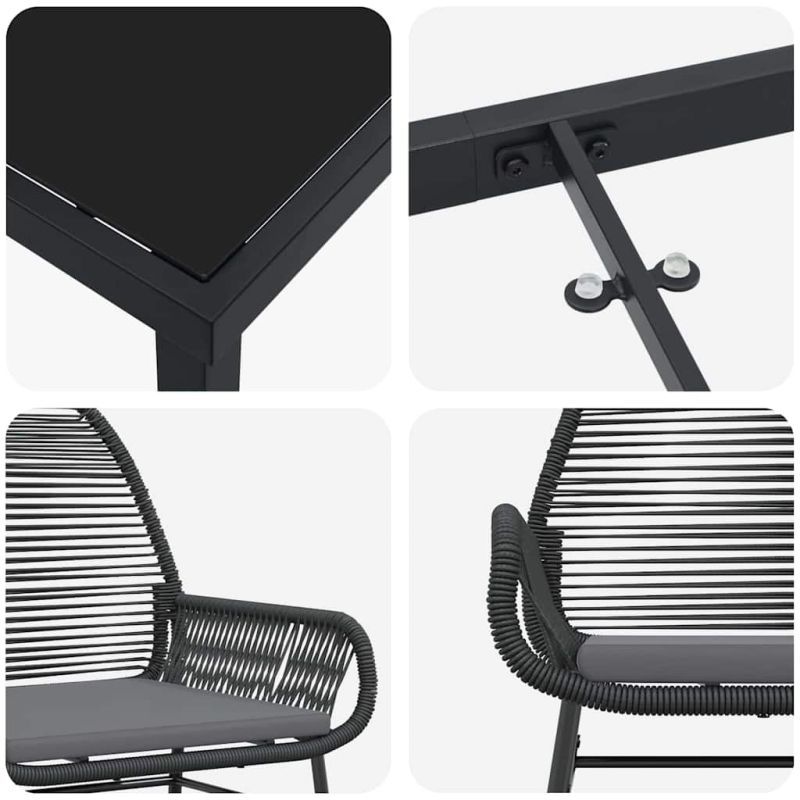Този комплект от полиратан е супер хит за всяка градина или тераса. Той съчетава стил и функционалност. Има нежни линии и прост дизайн, който се вписва идеално на открито. Перфектен е за летни вечери с приятели или семейство. Осигурява комфорт и удоволствие на всяко хранене. Полиратаново покритие: Издръжливият полиратан е идеален за открито, устойчив на всякакви метеорологични явления. Той не само изглежда стилно, но и запазва качествата си с времето. Подкрепа от прахово боядисана стомана: Здравата рамка е стабилна и надеждна. Тя защитва конструкцията и осигурява надеждност при всякакви условия. Удобни седалки с възглавнички: Седалките от полиестер предлагат комфорт, идеален за продължително ползване. Гостите могат да се насладят на храната в удобна обстановка. Черен стъклен плот: Черното закалено стъкло добавя стил и улеснява почистването, без да жертва елегантността. Лесна поддръжка: За да запазите комплекта в отлично състояние, следвайте насоките: използвайте покритие, когато не е в употреба – това увеличава дълготрайността му. Максимално 110 кг на седалка. Съобразете се с риска от открит огън и други източници на силна топлина в близост до продукта.